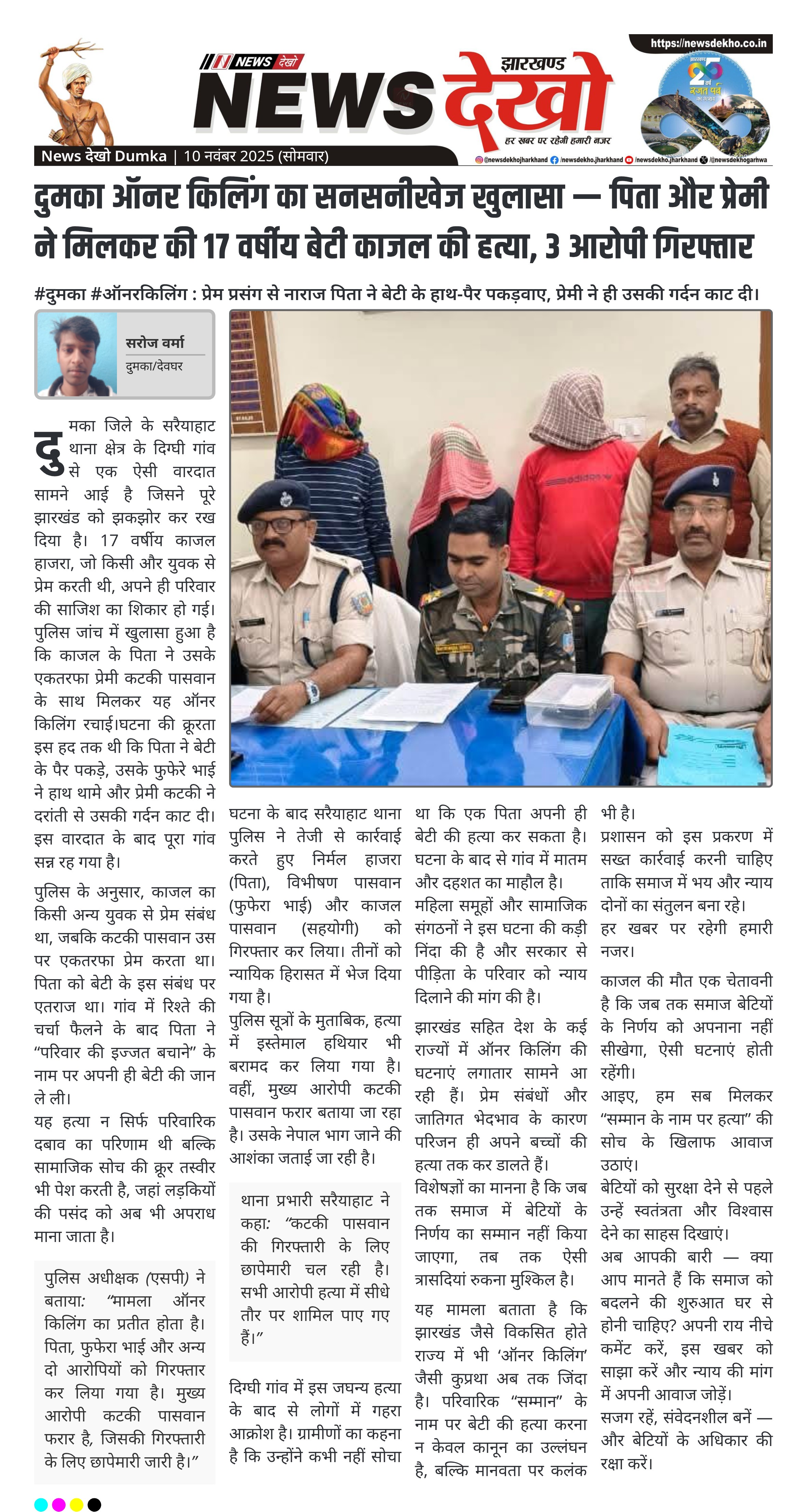 दुमका ऑनर किलिंग का सनसनीखेज खुलासा — पिता और प्रेमी ने मिलकर की 17 वर्षीय बेटी काजल की हत्या, 3 आरोपी गिरफ्तार