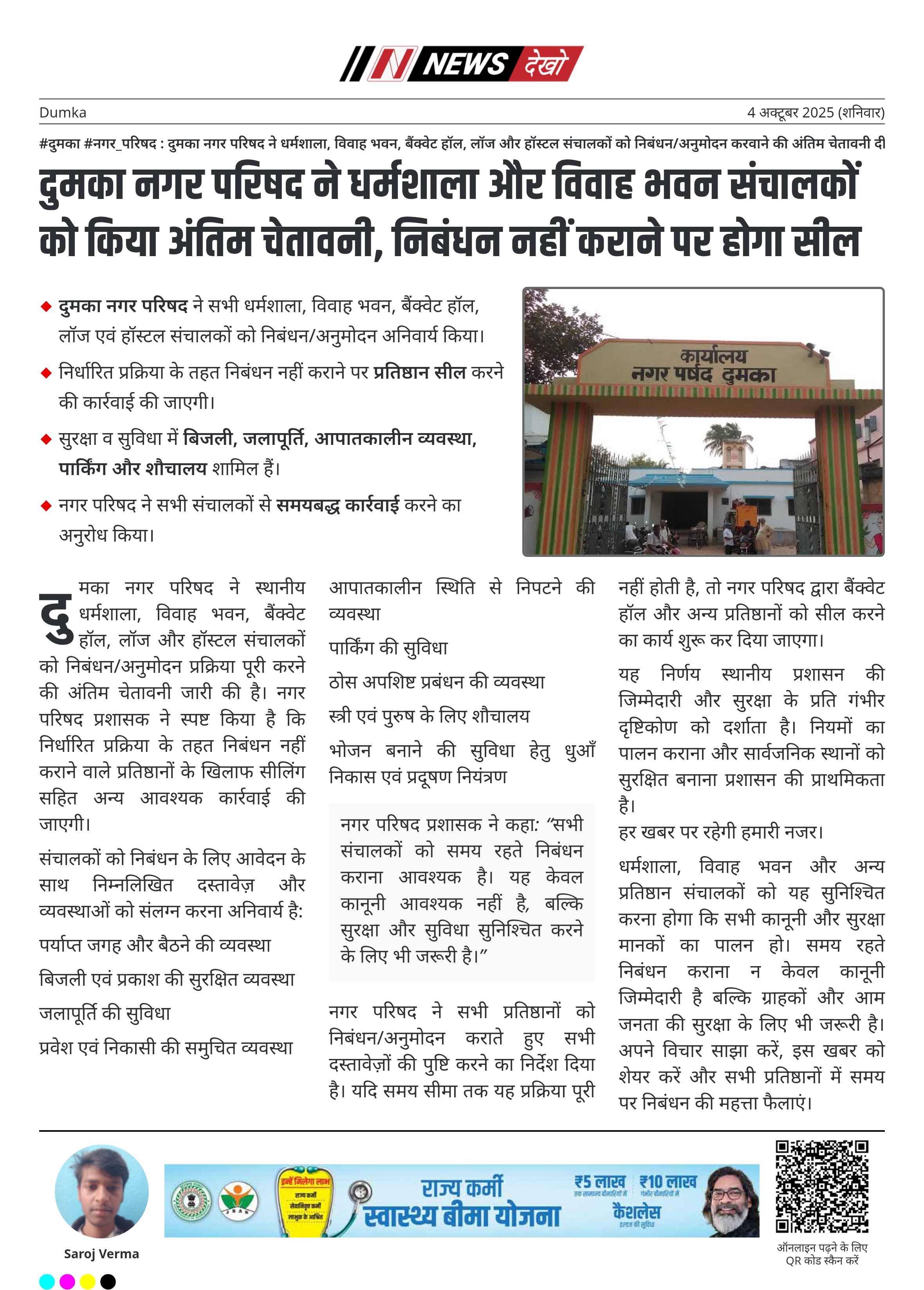- दुमका नगर परिषद ने सभी धर्मशाला, विवाह भवन, बैंक्वेट हॉल, लॉज एवं हॉस्टल संचालकों को निबंधन/अनुमोदन अनिवार्य किया।