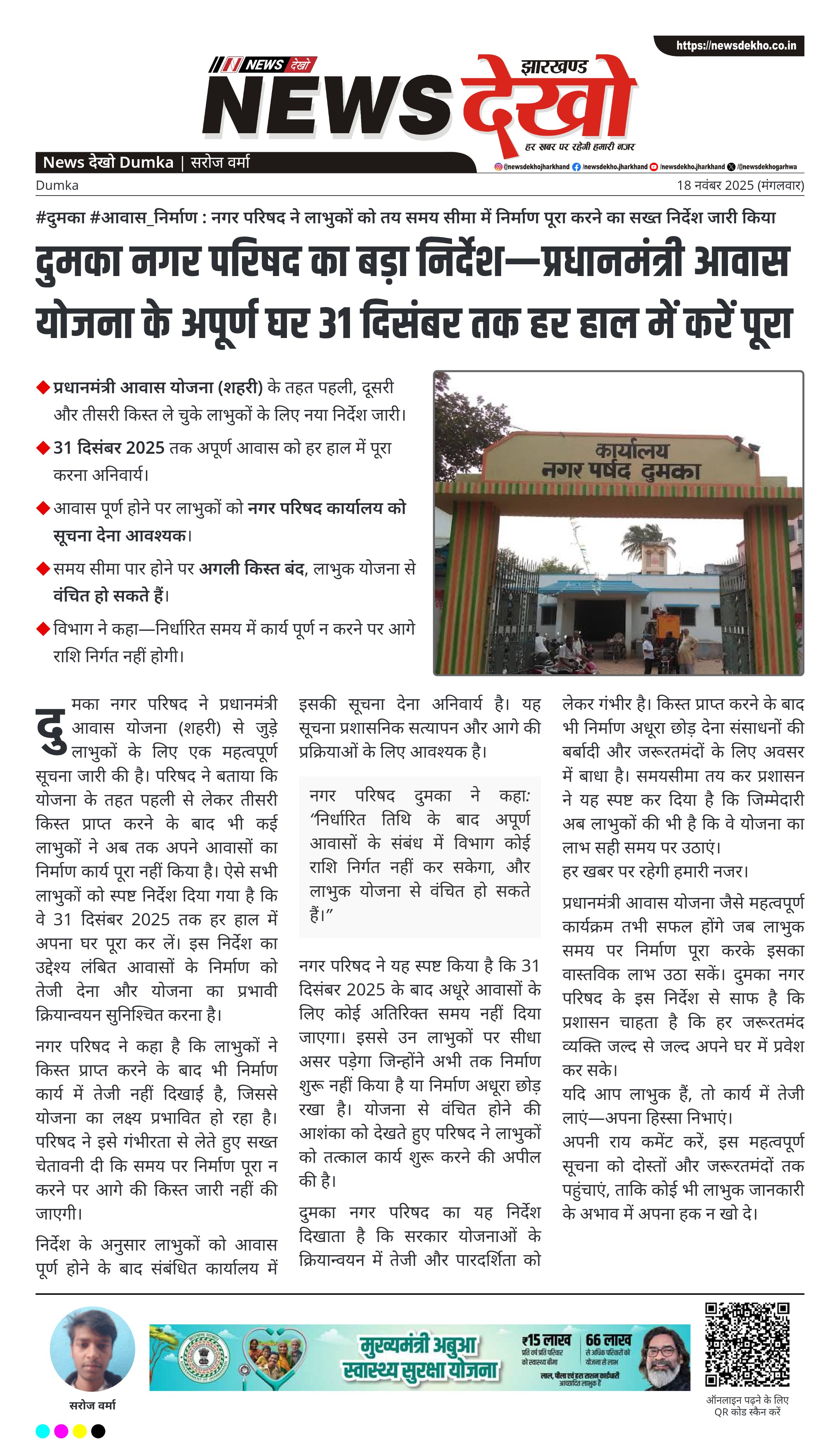 दुमका नगर परिषद ने प्रधानमंत्री आवास योजना (शहरी) से जुड़े लाभुकों के लिए एक महत्वपूर्ण सूचना जारी की है। परिषद ने बताया कि योजना के तहत पहली से लेकर तीसरी किस्त प्राप्त करने के बाद भी कई लाभुकों ने अब तक अपने आवासों का निर्माण कार्य पूरा नहीं किया है। ऐसे सभी लाभुकों को स्पष्ट निर्देश दिया गया है कि वे 31 दिसंबर 2025 तक हर हाल में अपना घर पूरा कर लें। इस निर्देश का उद्देश्य लंबित आवासों के निर्माण को तेजी देना और योजना का प्रभावी क्रियान्वयन सुनिश्चित करना है।