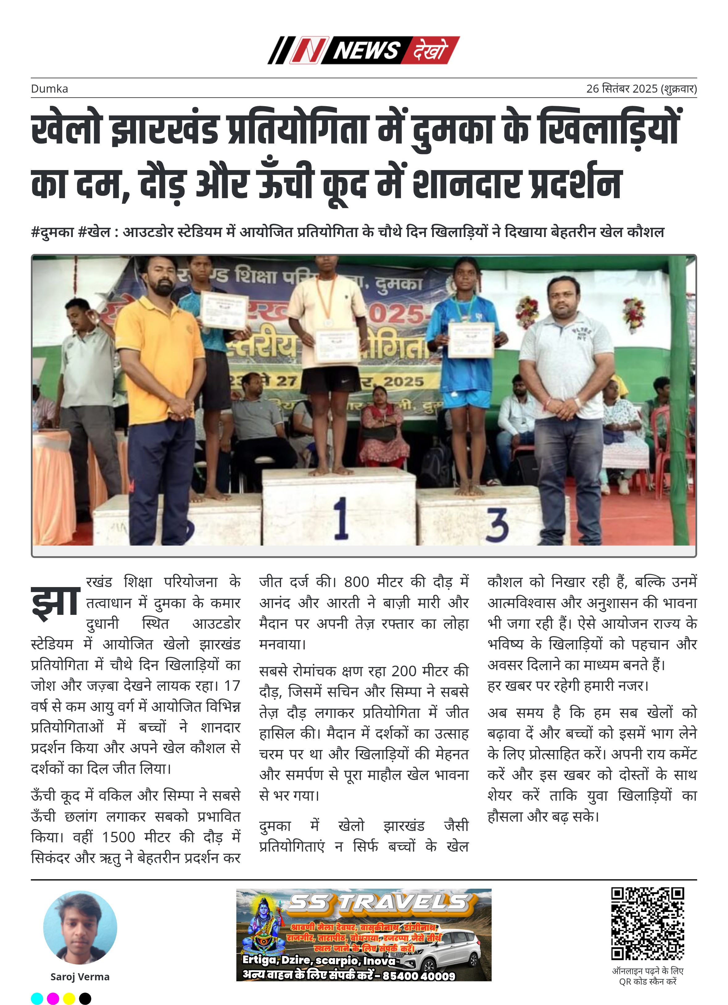 दुमका में खेलो झारखंड जैसी प्रतियोगिताएं न सिर्फ बच्चों के खेल कौशल को निखार रही हैं, बल्कि उनमें आत्मविश्वास और अनुशासन की भावना भी जगा रही हैं। ऐसे आयोजन राज्य के भविष्य के खिलाड़ियों को पहचान और अवसर दिलाने का माध्यम बनते हैं।