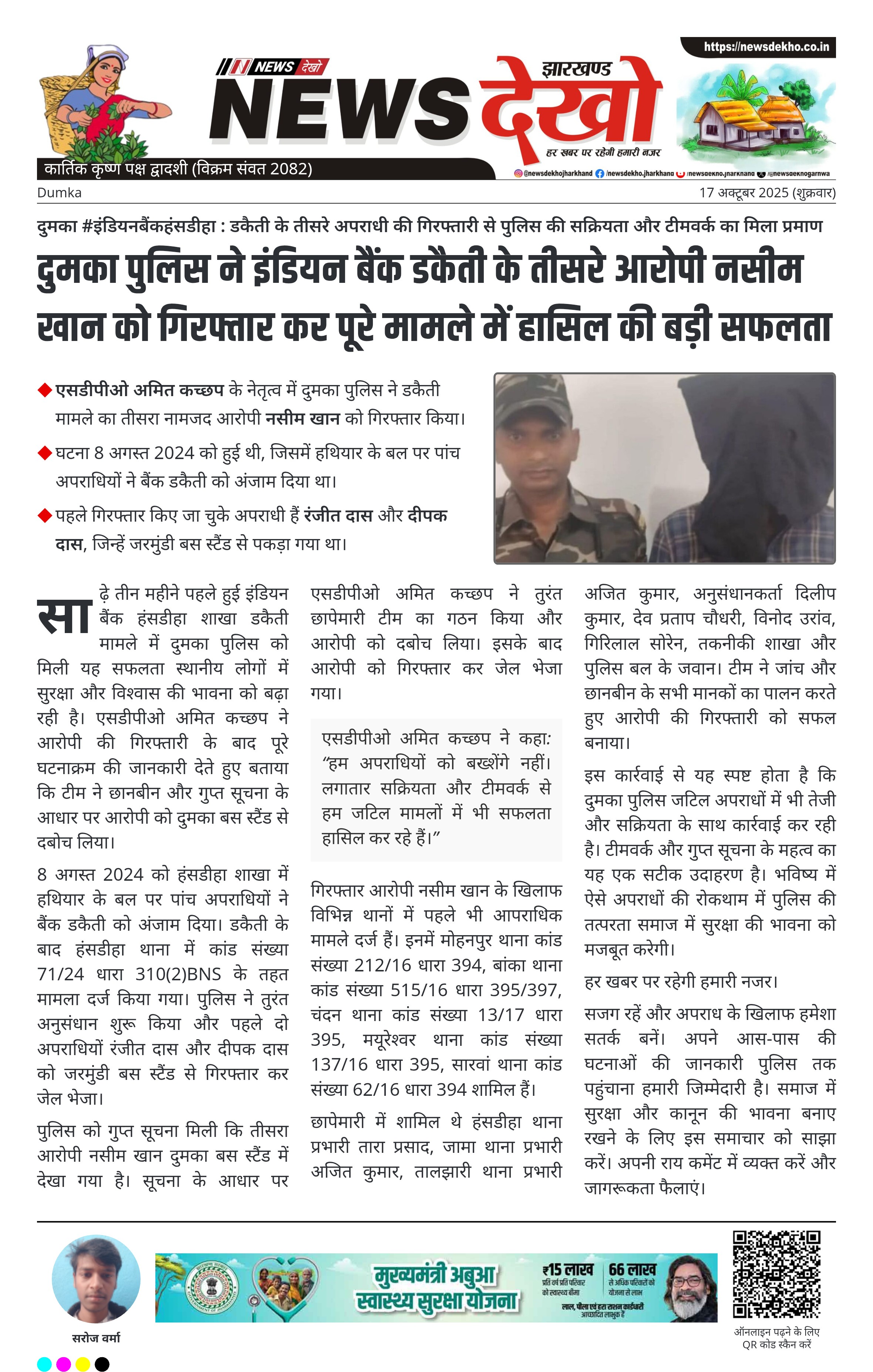 दुमका #इंडियनबैंकहंसडीहा : डकैती के तीसरे अपराधी की गिरफ्तारी से पुलिस की सक्रियता और टीमवर्क का मिला प्रमाण