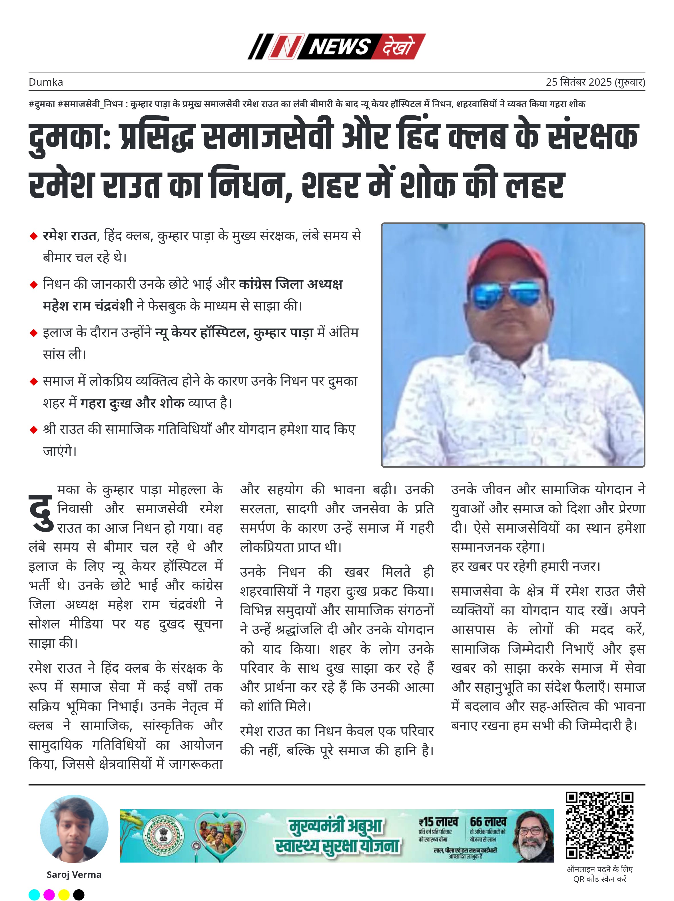 न्यूज़ देखो: दुमका के समाजसेवी रमेश राउत के निधन से समाज में क्षति