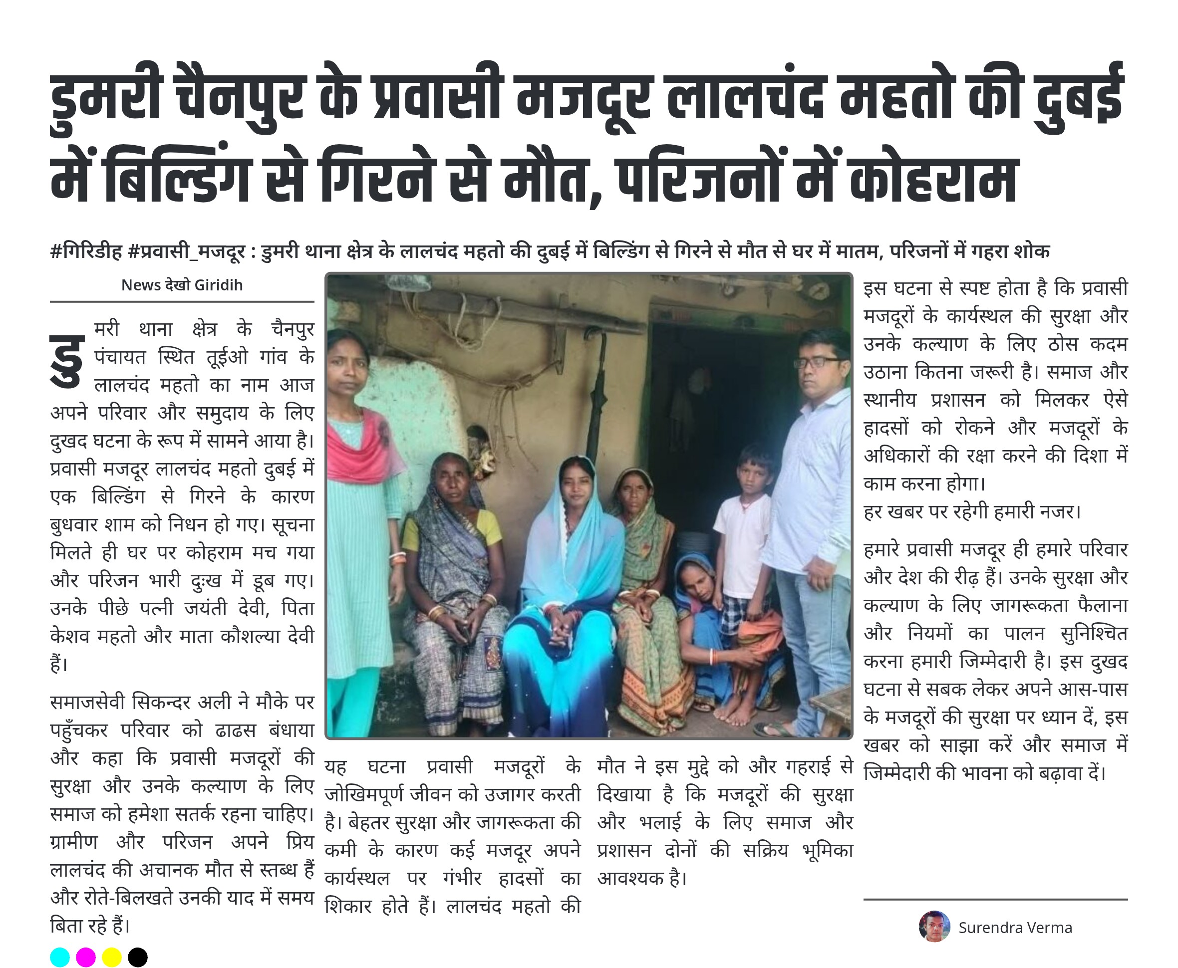 #गिरिडीह #प्रवासी_मजदूर : डुमरी थाना क्षेत्र के लालचंद महतो की दुबई में बिल्डिंग से गिरने से मौत से घर में मातम, परिजनों में गहरा शोक