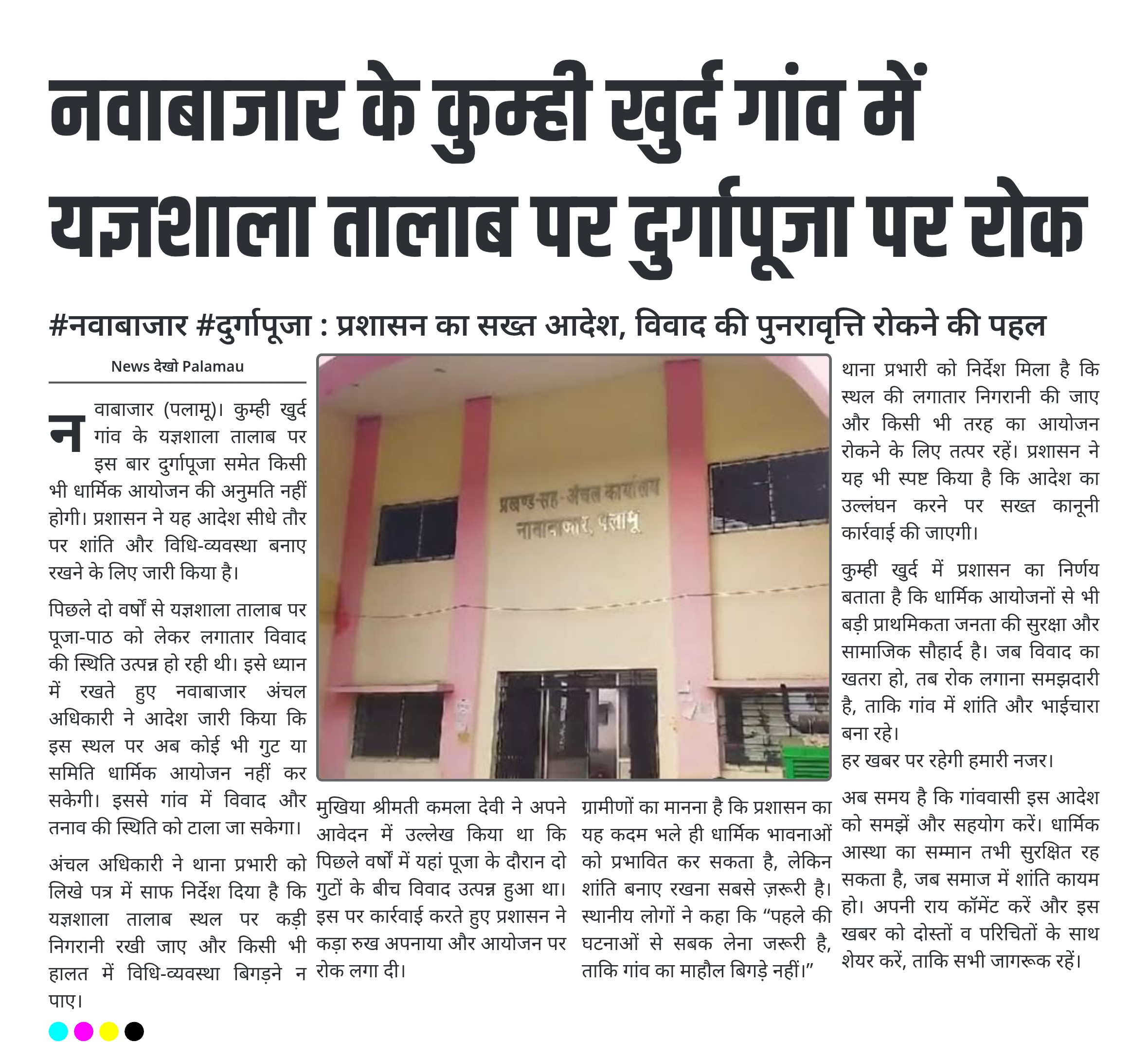 नवाबाजार (पलामू)। कुम्ही खुर्द गांव के यज्ञशाला तालाब पर इस बार दुर्गापूजा समेत किसी भी धार्मिक आयोजन की अनुमति नहीं होगी। प्रशासन ने यह आदेश सीधे तौर पर शांति और विधि-व्यवस्था बनाए रखने के लिए जारी किया है।