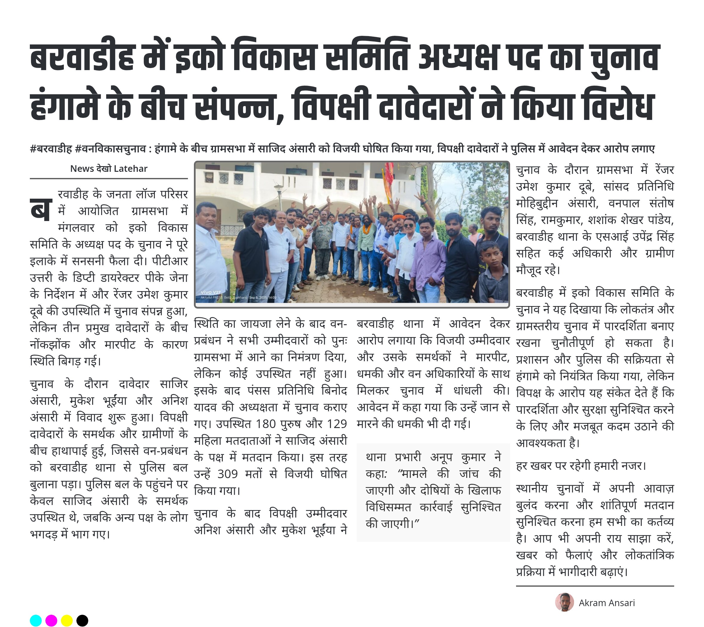 #बरवाडीह #वनविकासचुनाव : हंगामे के बीच ग्रामसभा में साजिद अंसारी को विजयी घोषित किया गया, विपक्षी दावेदारों ने पुलिस में आवेदन देकर आरोप लगाए