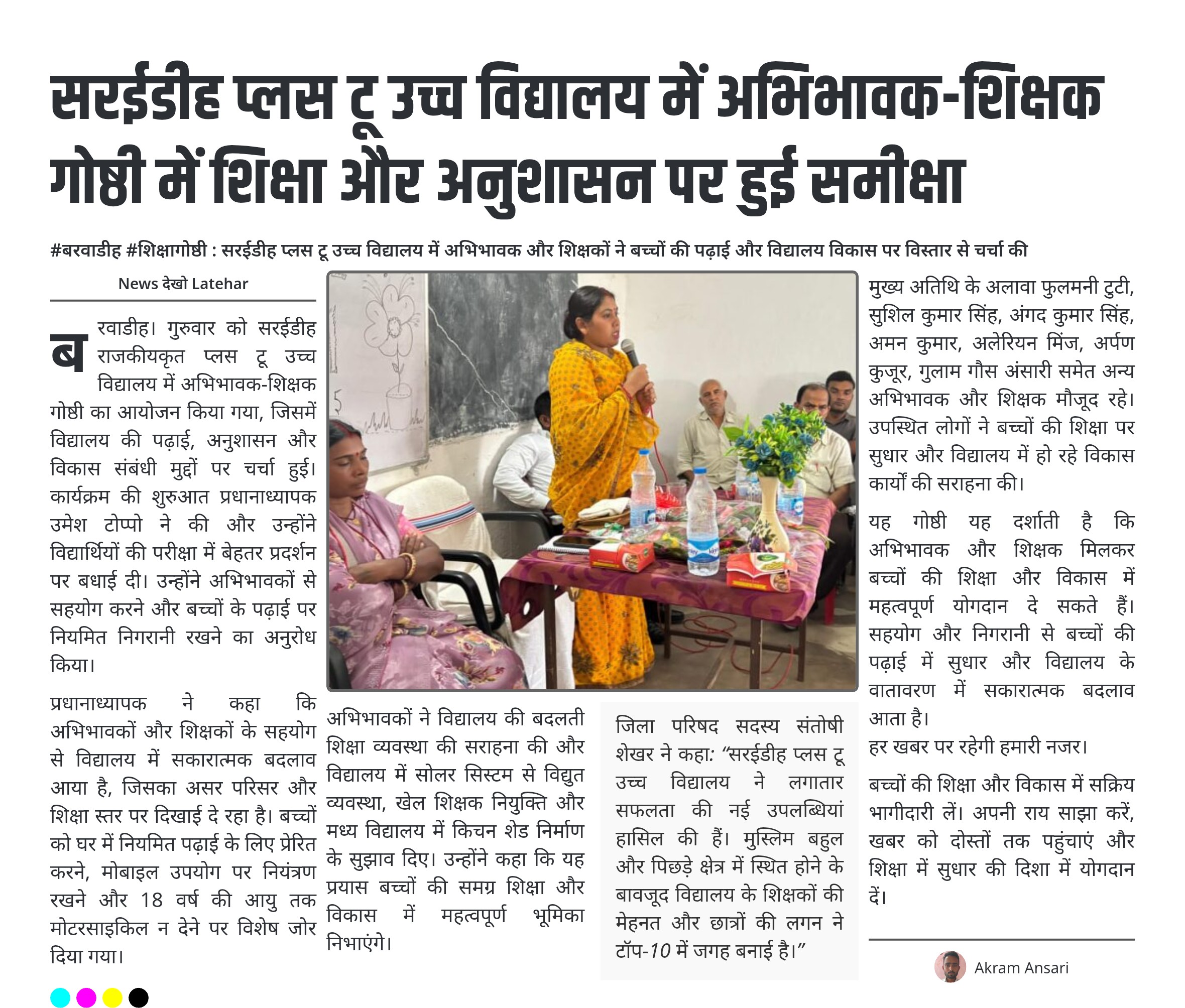 बरवाडीह। गुरुवार को सरईडीह राजकीयकृत प्लस टू उच्च विद्यालय में अभिभावक-शिक्षक गोष्ठी का आयोजन किया गया, जिसमें विद्यालय की पढ़ाई, अनुशासन और विकास संबंधी मुद्दों पर चर्चा हुई। कार्यक्रम की शुरुआत प्रधानाध्यापक उमेश टोप्पो ने की और उन्होंने विद्यार्थियों की परीक्षा में बेहतर प्रदर्शन पर बधाई दी। उन्होंने अभिभावकों से सहयोग करने और बच्चों के पढ़ाई पर नियमित निगरानी रखने का अनुरोध किया।