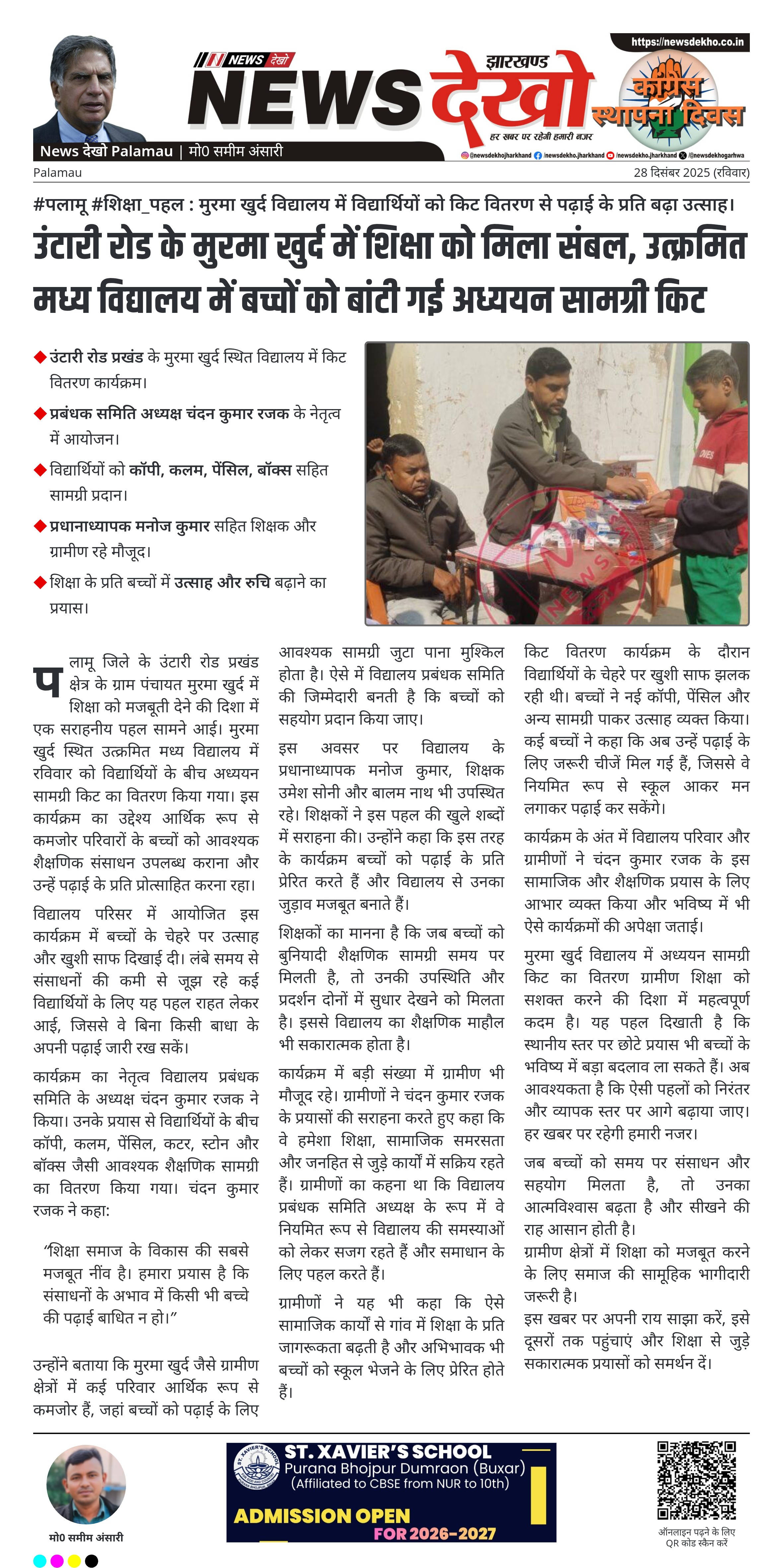 पलामू जिले के उंटारी रोड प्रखंड अंतर्गत मुरमा खुर्द पंचायत स्थित उत्क्रमित मध्य विद्यालय में रविवार को शिक्षा को प्रोत्साहित करने के उद्देश्य से अध्ययन सामग्री किट का वितरण किया गया। कार्यक्रम का नेतृत्व विद्यालय प्रबंधक समिति अध्यक्ष चंदन कुमार रजक ने किया। विद्यार्थियों को आवश्यक शैक्षणिक सामग्री उपलब्ध कराकर उनकी पढ़ाई में आ रही संसाधन संबंधी बाधाओं को दूर करने का प्रयास किया गया। इस पहल से बच्चों और ग्रामीणों में सकारात्मक संदेश गया।