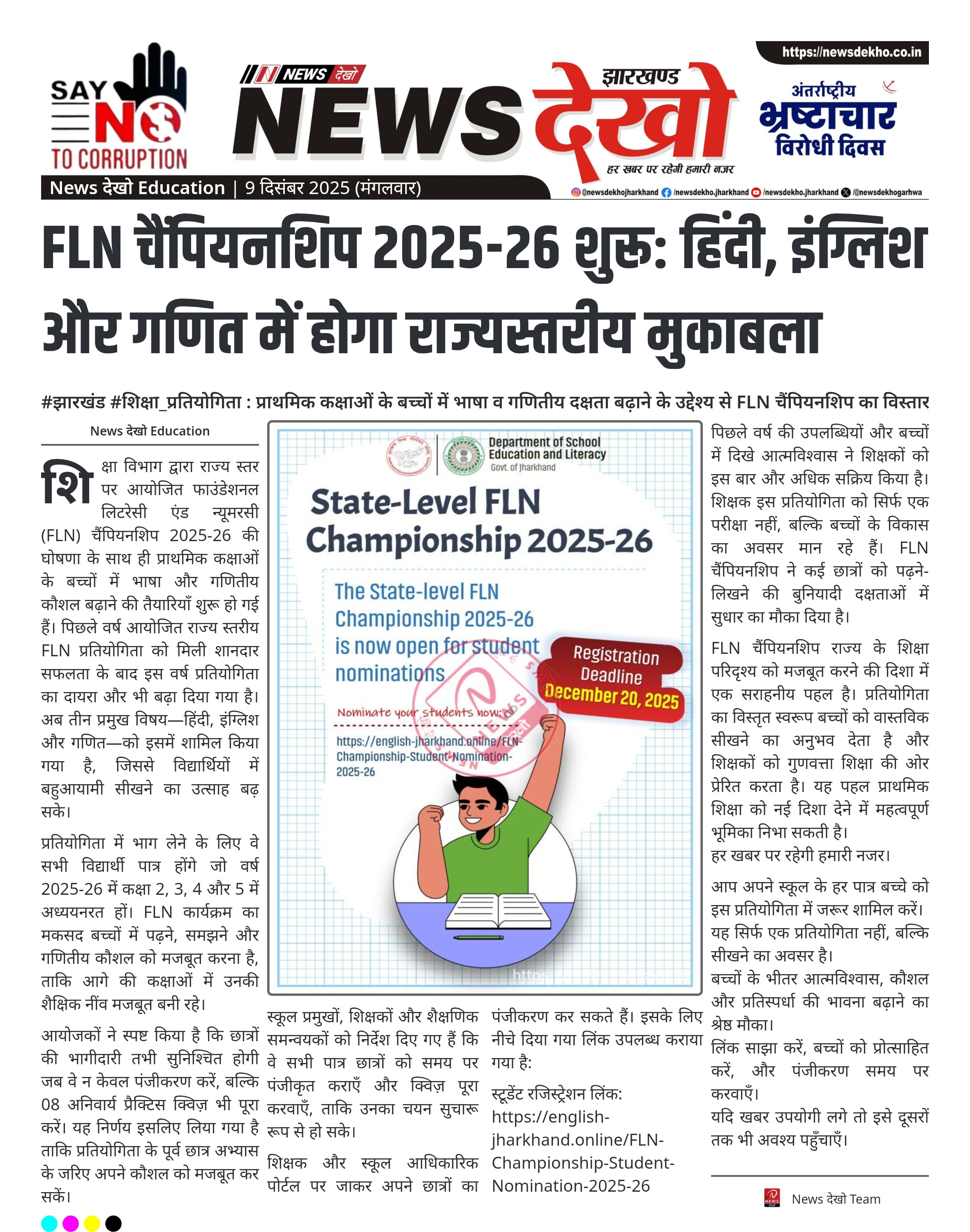 #झारखंड #शिक्षा_प्रतियोगिता : प्राथमिक कक्षाओं के बच्चों में भाषा व गणितीय दक्षता बढ़ाने के उद्देश्य से FLN चैंपियनशिप का विस्तार फाउंडेशनल लिटरेसी एंड न्यूमरसी (FLN) चैंपियनशिप 2025-26 की आधिकारिक घोषणा। इस बार हिंदी, इंग्लिश और गणित तीनों विषयों को प्रतियोगिता में शामिल किया गया। कक्षा 2 से 5 के छात्र…