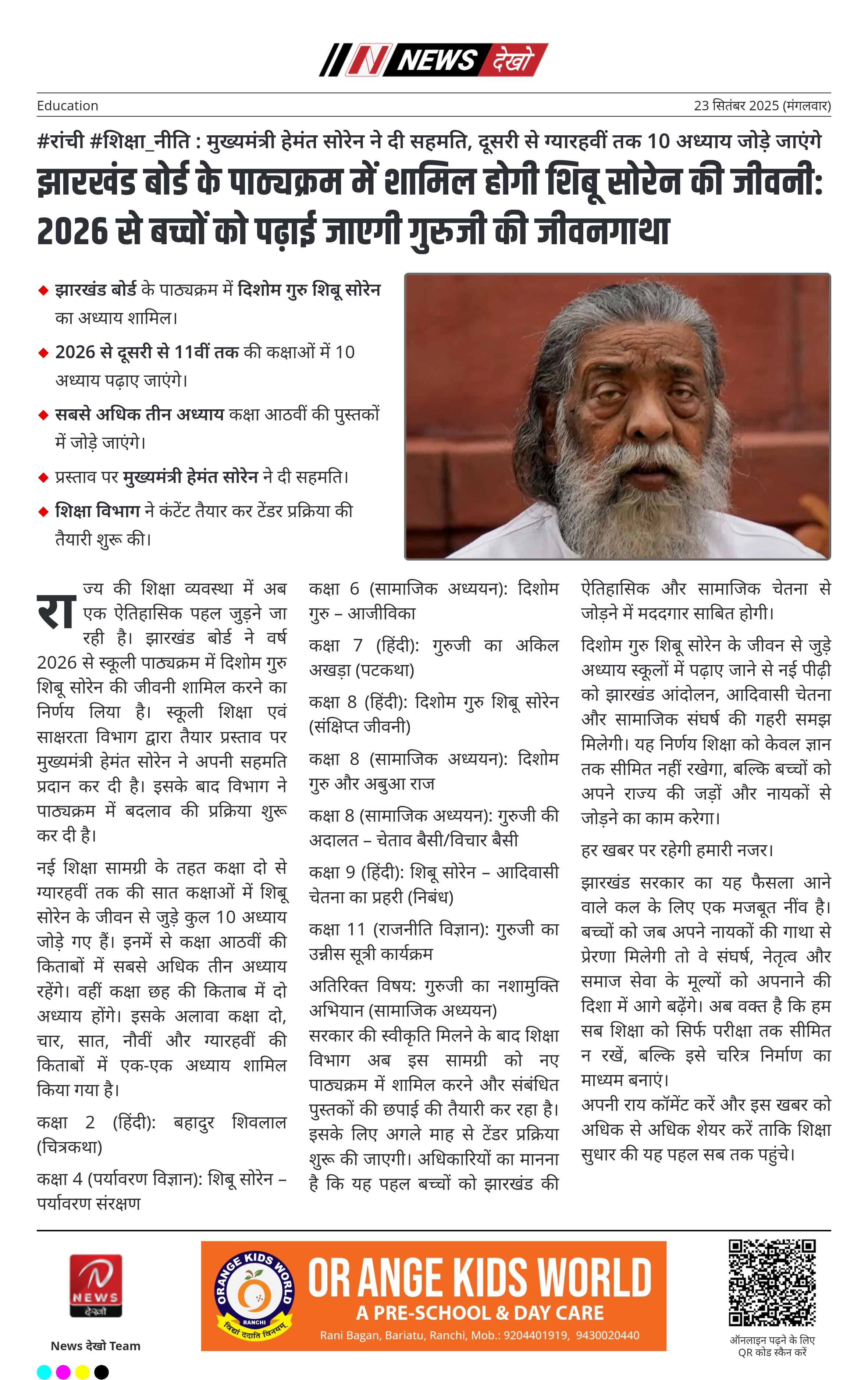 #रांची #शिक्षा_नीति : मुख्यमंत्री हेमंत सोरेन ने दी सहमति, दूसरी से ग्यारहवीं तक 10 अध्याय जोड़े जाएंगे झारखंड बोर्ड के पाठ्यक्रम में दिशोम गुरु शिबू सोरेन का अध्याय शामिल। 2026 से दूसरी से 11वीं तक की कक्षाओं में 10 अध्याय पढ़ाए जाएंगे। सबसे अधिक तीन अध्याय कक्षा आठवीं की पुस्तकों…