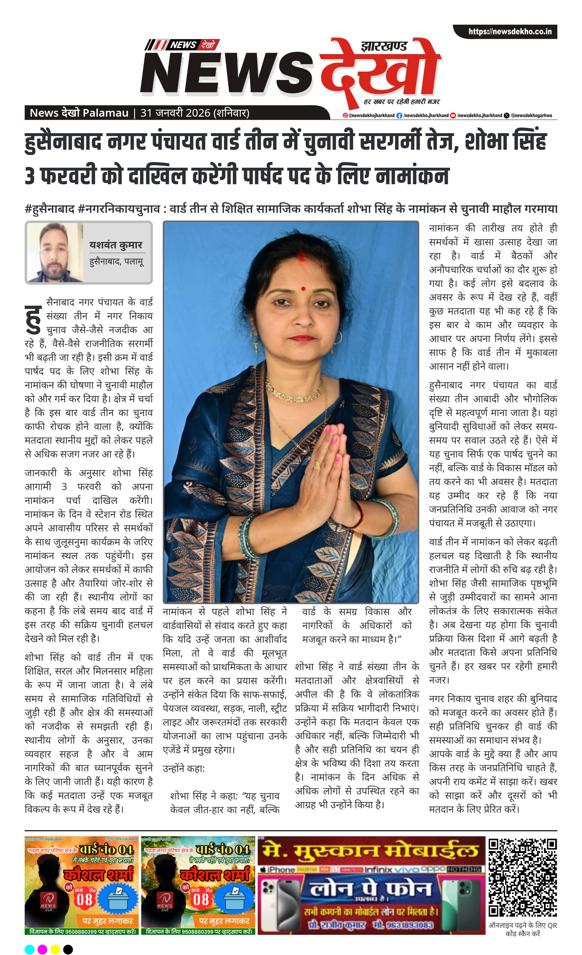 वार्ड तीन में नामांकन को लेकर बढ़ती हलचल यह दिखाती है कि स्थानीय राजनीति में लोगों की रुचि बढ़ रही है। शोभा सिंह जैसी सामाजिक पृष्ठभूमि से जुड़ी उम्मीदवारों का सामने आना लोकतंत्र के लिए सकारात्मक संकेत है। अब देखना यह होगा कि चुनावी प्रक्रिया किस दिशा में आगे बढ़ती है और मतदाता किसे अपना प्रतिनिधि चुनते हैं। हर खबर पर रहेगी हमारी नजर।