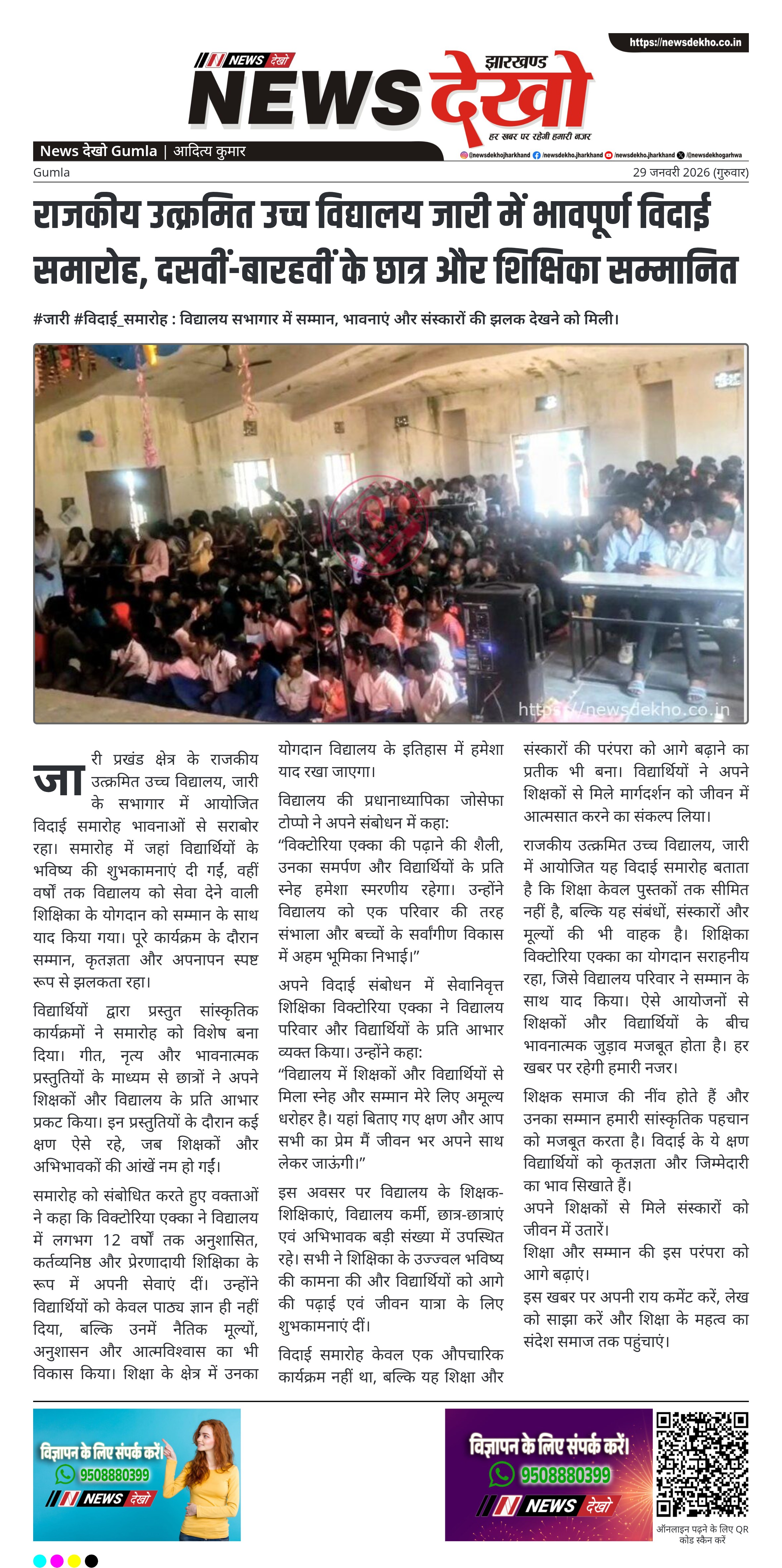 राजकीय उत्क्रमित उच्च विद्यालय, जारी में आयोजित यह विदाई समारोह बताता है कि शिक्षा केवल पुस्तकों तक सीमित नहीं है, बल्कि यह संबंधों, संस्कारों और मूल्यों की भी वाहक है। शिक्षिका विक्टोरिया एक्का का योगदान सराहनीय रहा, जिसे विद्यालय परिवार ने सम्मान के साथ याद किया। ऐसे आयोजनों से शिक्षकों और विद्यार्थियों के बीच भावनात्मक जुड़ाव मजबूत होता है। हर खबर पर रहेगी हमारी नजर।