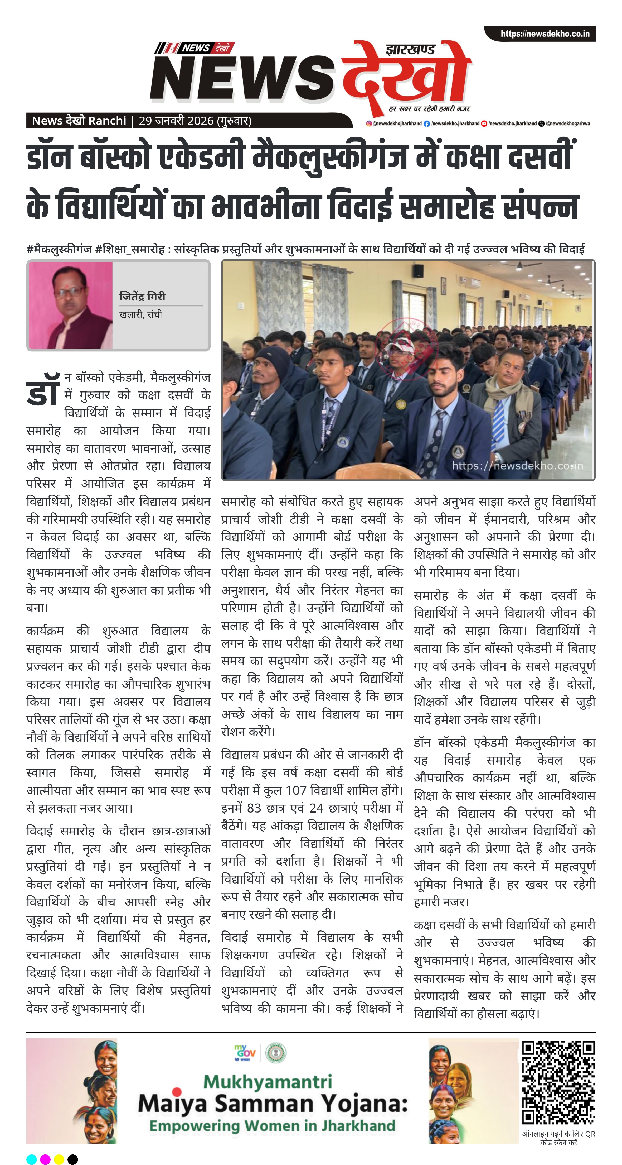 • डॉन बॉस्को एकेडमी मैकलुस्कीगंज में कक्षा दसवीं के छात्रों के लिए विदाई समारोह आयोजित।