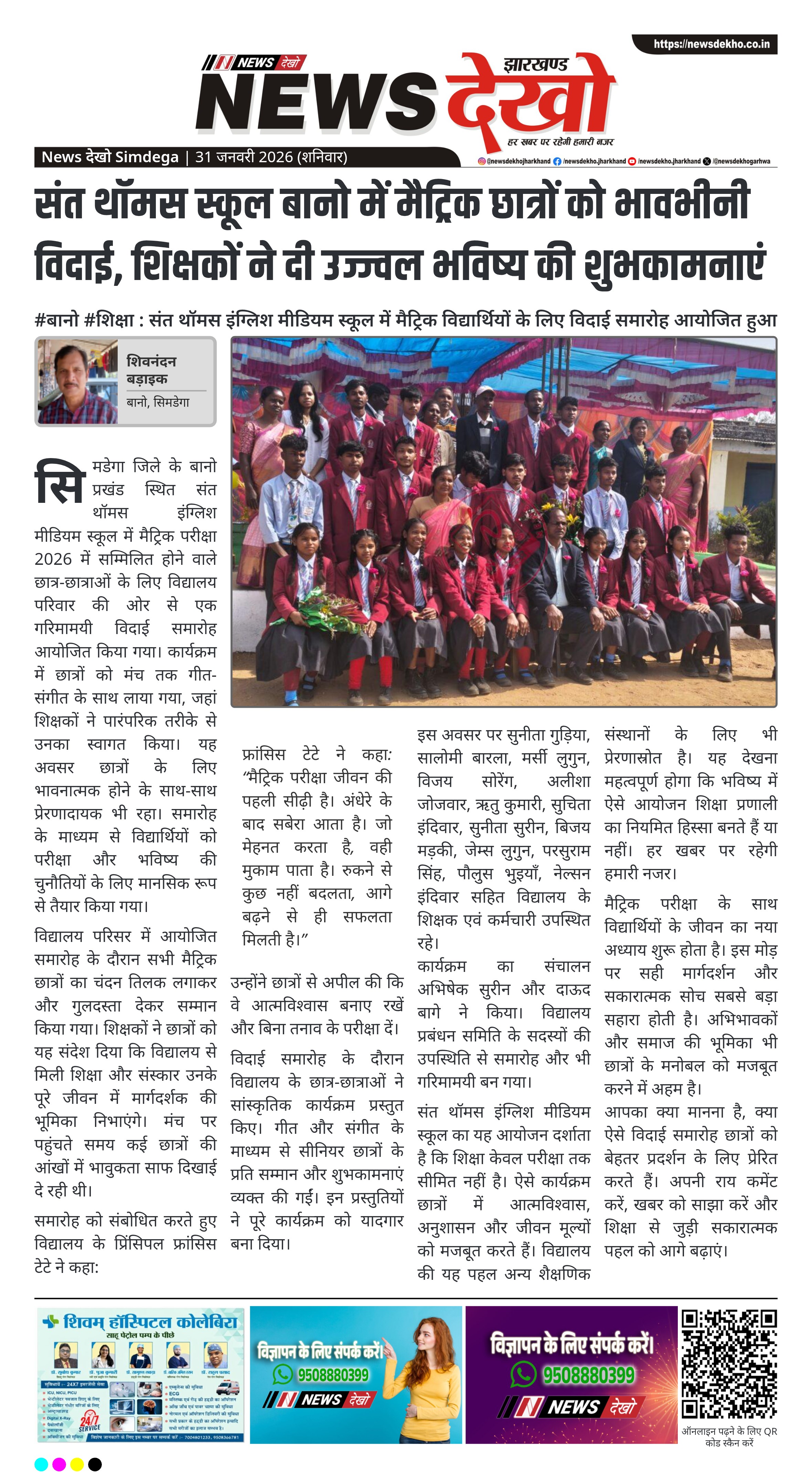 सिमडेगा जिले के बानो स्थित संत थॉमस इंग्लिश मीडियम स्कूल में मैट्रिक परीक्षा में शामिल होने जा रहे छात्र-छात्राओं के लिए विदाई समारोह आयोजित किया गया। विद्यालय परिवार द्वारा पारंपरिक तरीके से विद्यार्थियों का सम्मान किया गया। समारोह में शिक्षकों ने परीक्षा के साथ जीवन मूल्यों पर भी मार्गदर्शन दिया। कार्यक्रम का उद्देश्य छात्रों को आत्मविश्वास के साथ आगामी शैक्षणिक और जीवन यात्रा के लिए तैयार करना रहा।