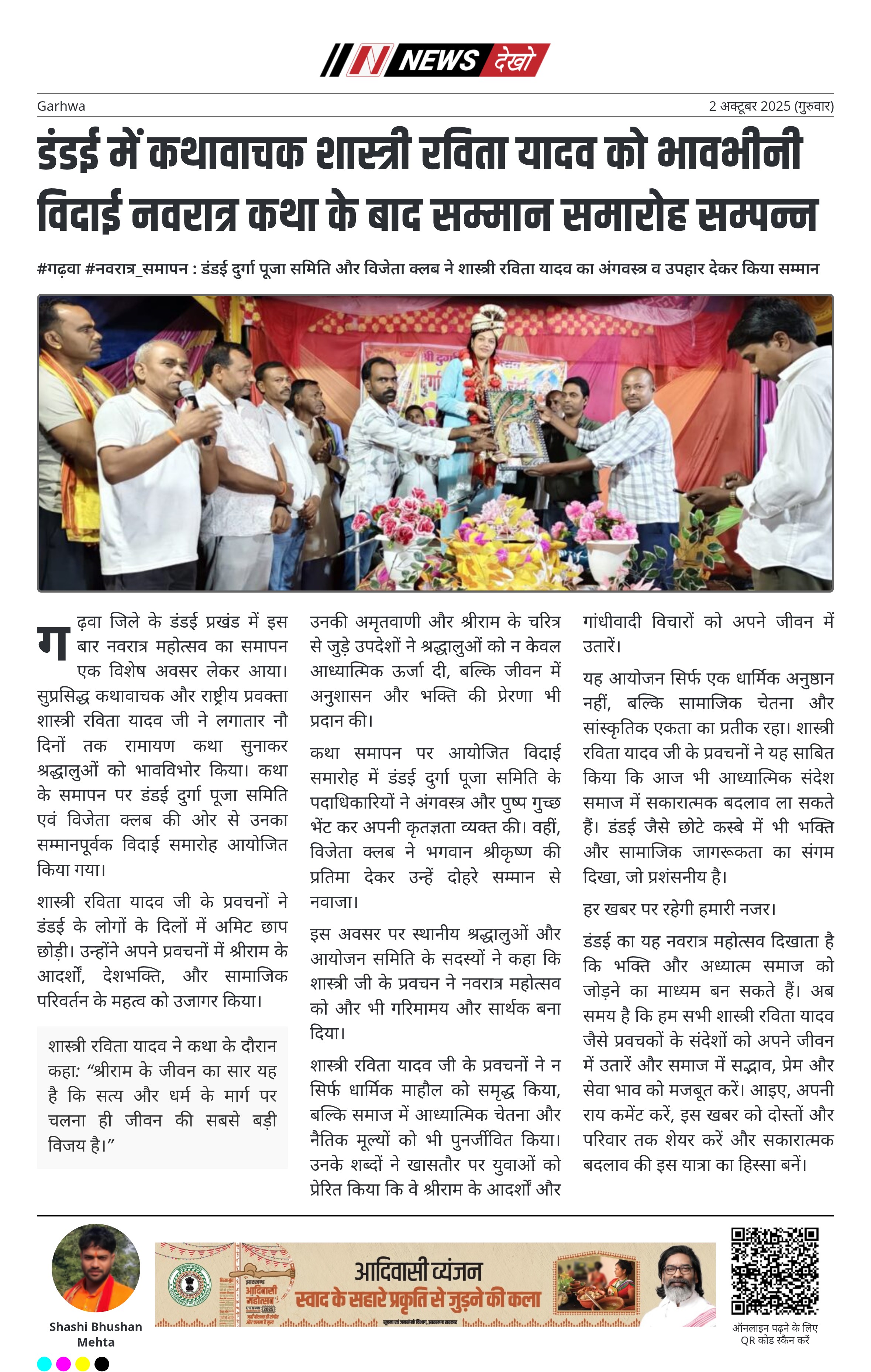 गढ़वा जिले के डंडई प्रखंड में इस बार नवरात्र महोत्सव का समापन एक विशेष अवसर लेकर आया। सुप्रसिद्ध कथावाचक और राष्ट्रीय प्रवक्ता शास्त्री रविता यादव जी ने लगातार नौ दिनों तक रामायण कथा सुनाकर श्रद्धालुओं को भावविभोर किया। कथा के समापन पर डंडई दुर्गा पूजा समिति एवं विजेता क्लब की ओर से उनका सम्मानपूर्वक विदाई समारोह आयोजित किया गया।