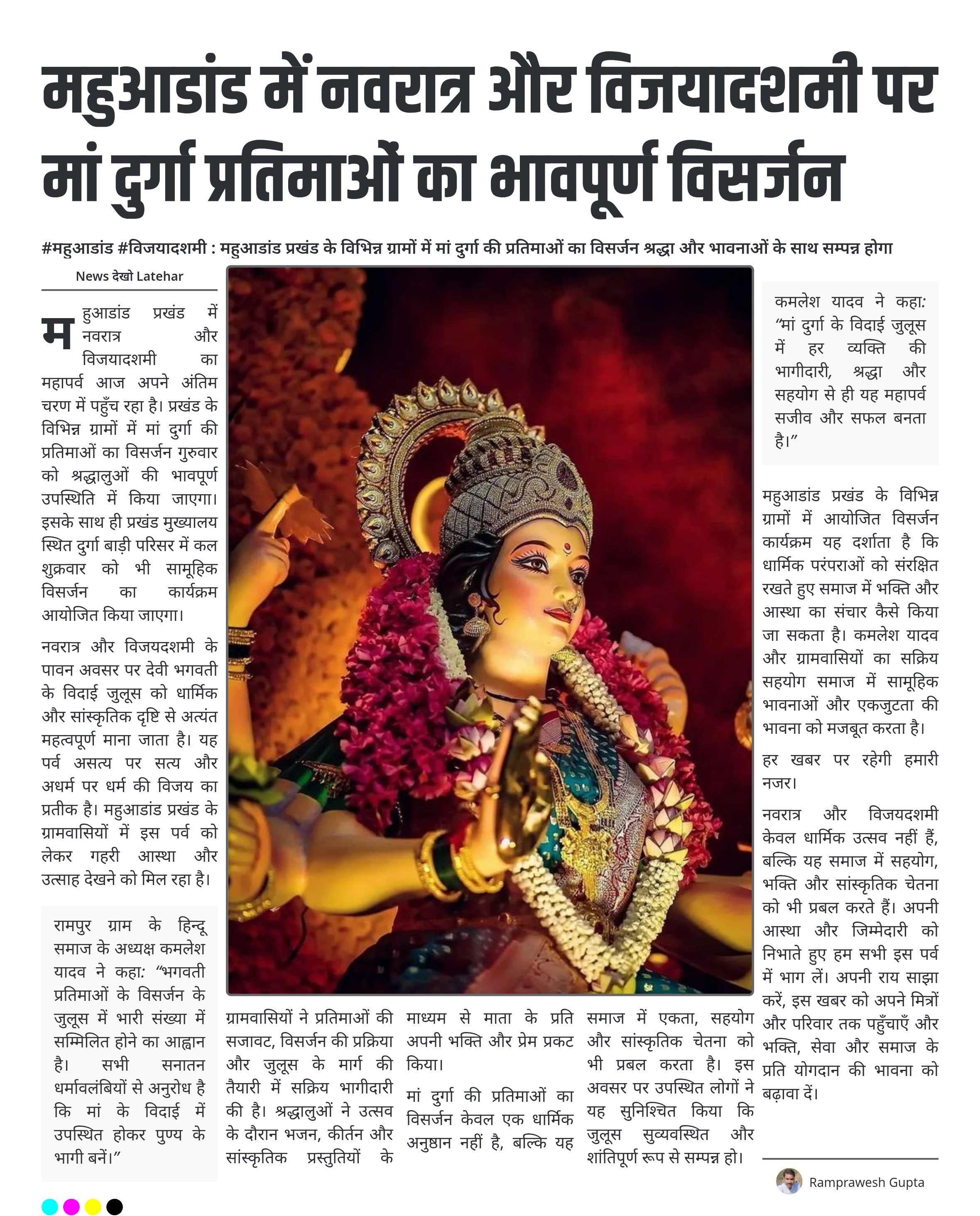कमलेश यादव ने कहा: “मां दुर्गा के विदाई जुलूस में हर व्यक्ति की भागीदारी, श्रद्धा और सहयोग से ही यह महापर्व सजीव और सफल बनता है।”