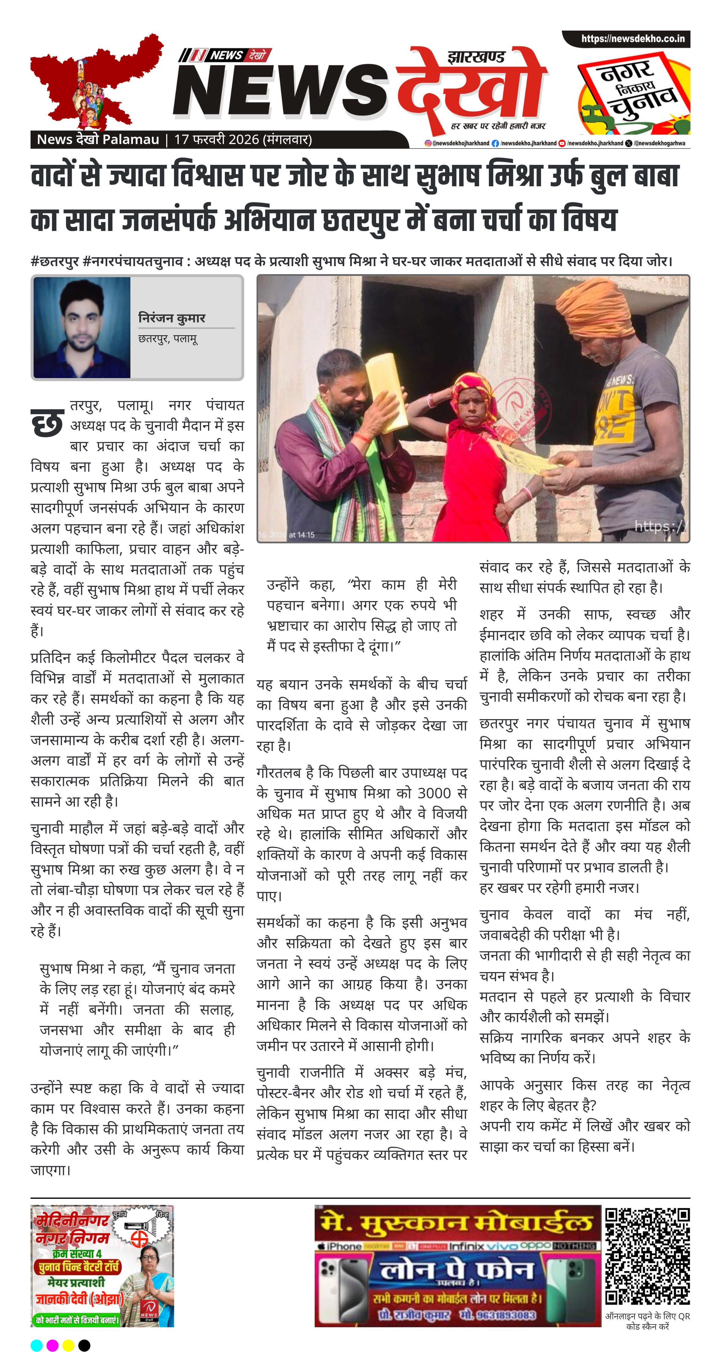 छतरपुर, पलामू। नगर पंचायत अध्यक्ष पद के चुनावी मैदान में इस बार प्रचार का अंदाज चर्चा का विषय बना हुआ है। अध्यक्ष पद के प्रत्याशी सुभाष मिश्रा उर्फ बुल बाबा अपने सादगीपूर्ण जनसंपर्क अभियान के कारण अलग पहचान बना रहे हैं। जहां अधिकांश प्रत्याशी काफिला, प्रचार वाहन और बड़े-बड़े वादों के साथ मतदाताओं तक पहुंच रहे हैं, वहीं सुभाष मिश्रा हाथ में पर्ची लेकर स्वयं घर-घर जाकर लोगों से संवाद कर रहे हैं।
