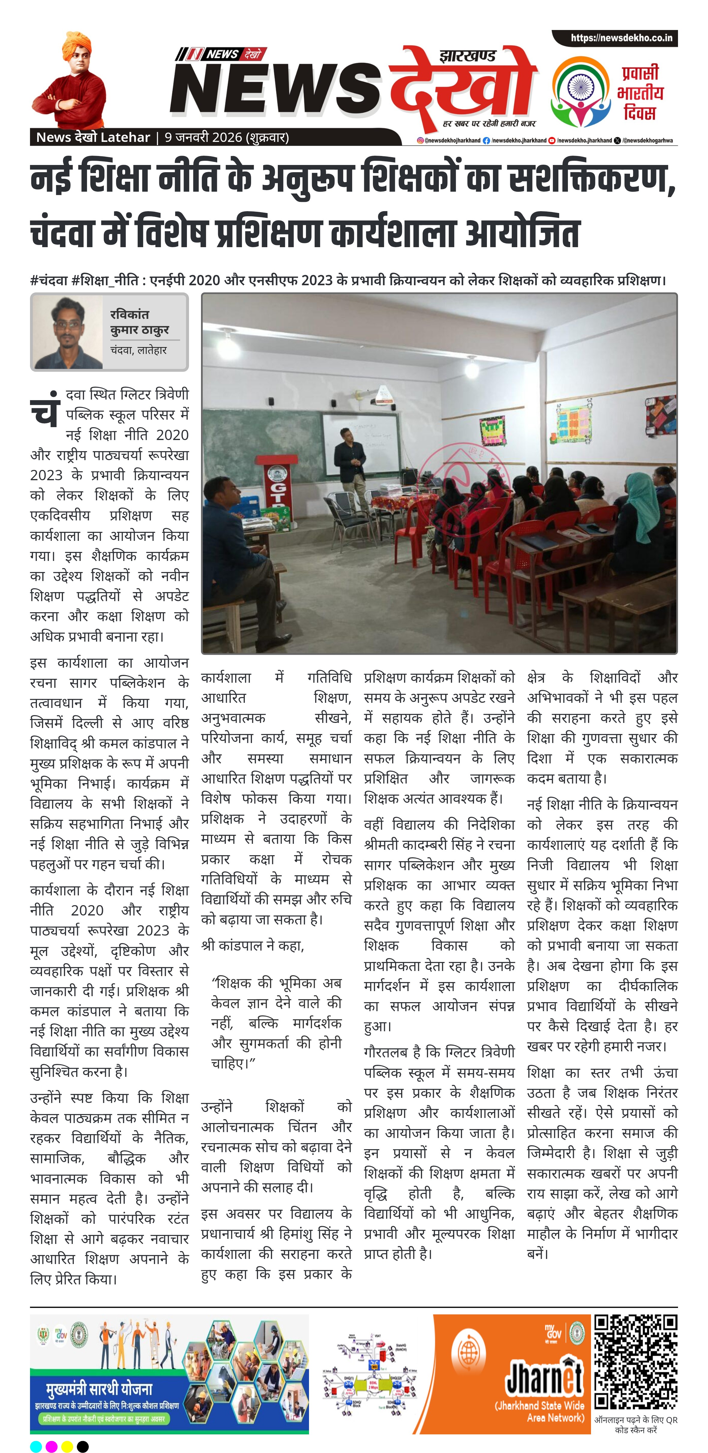 लातेहार जिले के चंदवा में नई शिक्षा नीति 2020 और राष्ट्रीय पाठ्यचर्या रूपरेखा 2023 के प्रभावी क्रियान्वयन को लेकर शिक्षकों के लिए विशेष प्रशिक्षण आयोजित किया गया। ग्लिटर त्रिवेणी पब्लिक स्कूल परिसर में हुई इस एकदिवसीय कार्यशाला में शिक्षण पद्धतियों को आधुनिक और विद्यार्थी-केंद्रित बनाने पर जोर दिया गया। दिल्ली से आए वरिष्ठ शिक्षाविद् कमल कांडपाल ने शिक्षकों को नई नीति के व्यवहारिक पहलुओं से अवगत कराया। यह कार्यक्रम शिक्षकों को समयानुकूल और गुणवत्तापूर्ण शिक्षा के लिए तैयार करने की दिशा में महत्वपूर्ण माना जा रहा है।