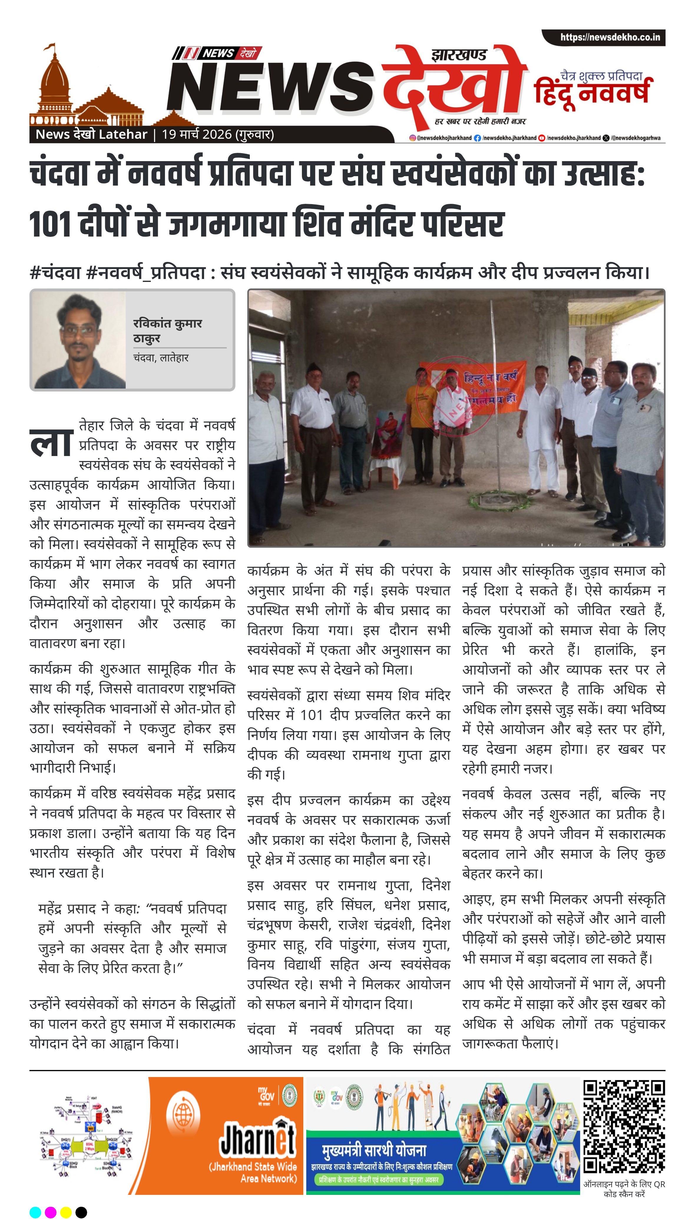 लातेहार जिले के चंदवा में राष्ट्रीय स्वयंसेवक संघ के स्वयंसेवकों ने नववर्ष प्रतिपदा उत्सव श्रद्धा और उत्साह के साथ मनाया। कार्यक्रम की शुरुआत सामूहिक गीत से हुई और नववर्ष के महत्व पर चर्चा की गई। संध्या समय शिव मंदिर परिसर में 101 दीप प्रज्वलित करने का निर्णय लिया गया। इस आयोजन ने पूरे क्षेत्र में सांस्कृतिक ऊर्जा और सकारात्मक माहौल का संचार किया।