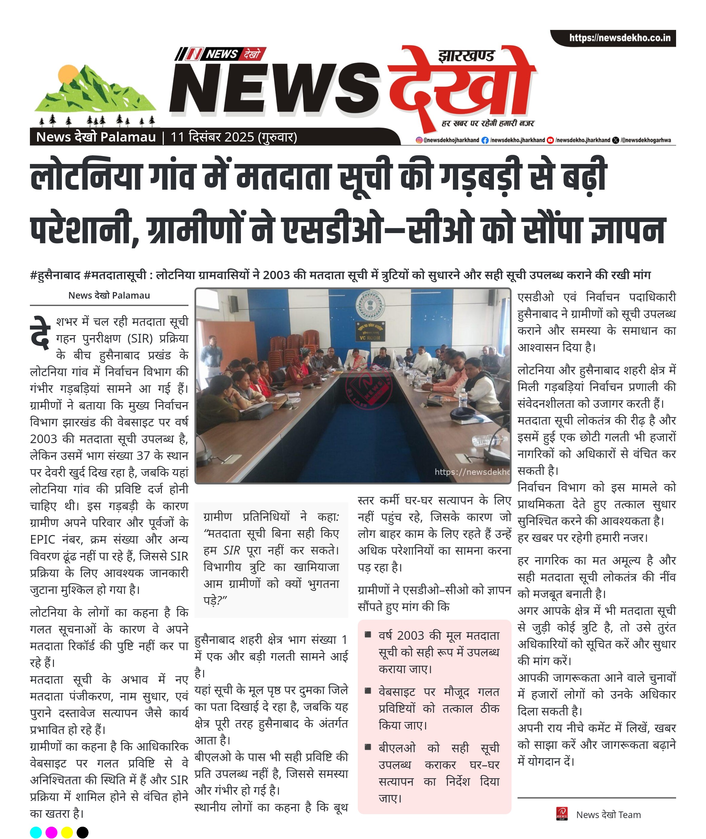 - लोटनिया गांव के ग्रामीणों ने एसडीओ एवं सीओ हुसैनाबाद को मतदाता सूची संबंधी त्रुटियों को लेकर ज्ञापन सौंपा।