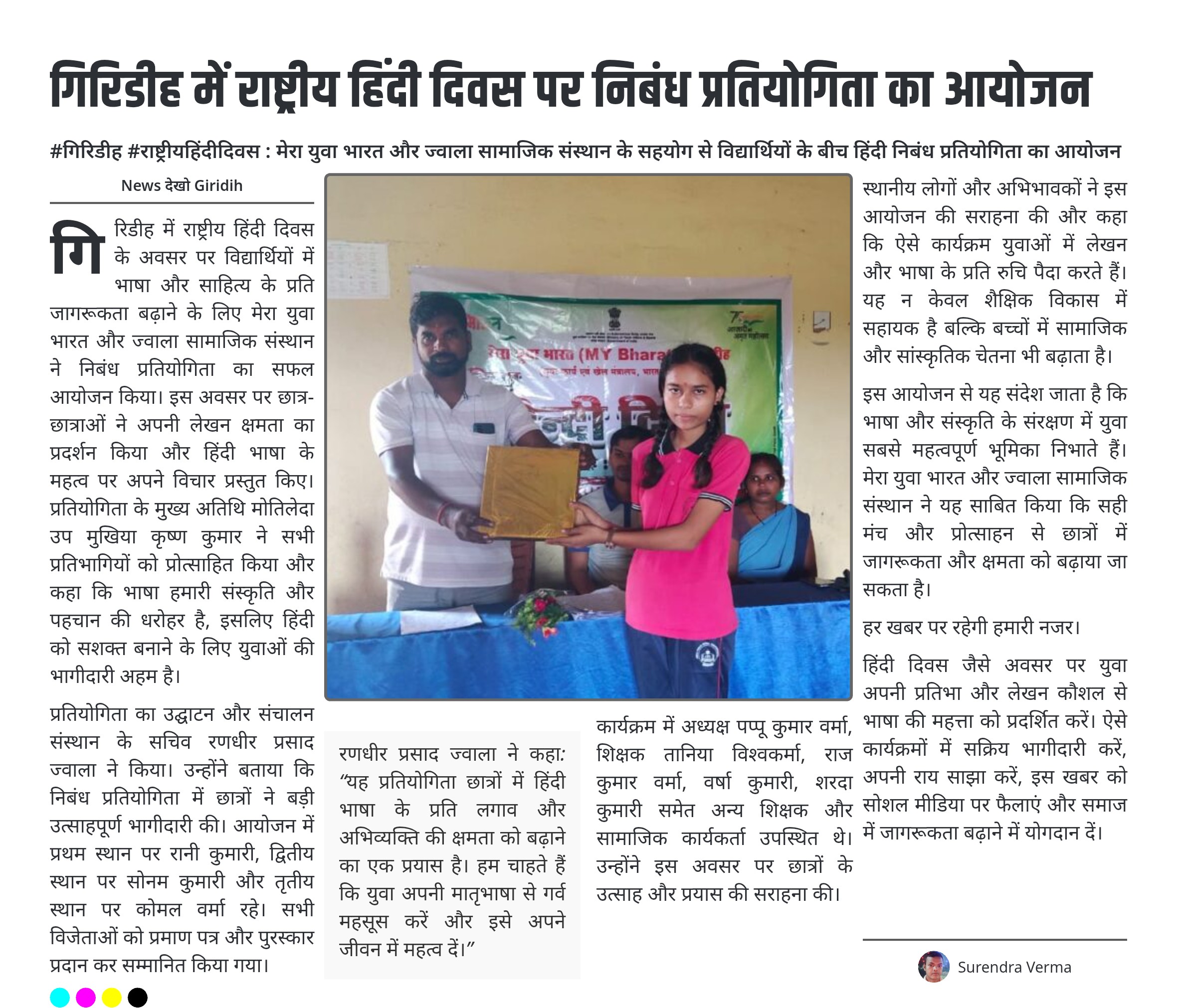 #गिरिडीह #राष्ट्रीयहिंदीदिवस : मेरा युवा भारत और ज्वाला सामाजिक संस्थान के सहयोग से विद्यार्थियों के बीच हिंदी निबंध प्रतियोगिता का आयोजन
