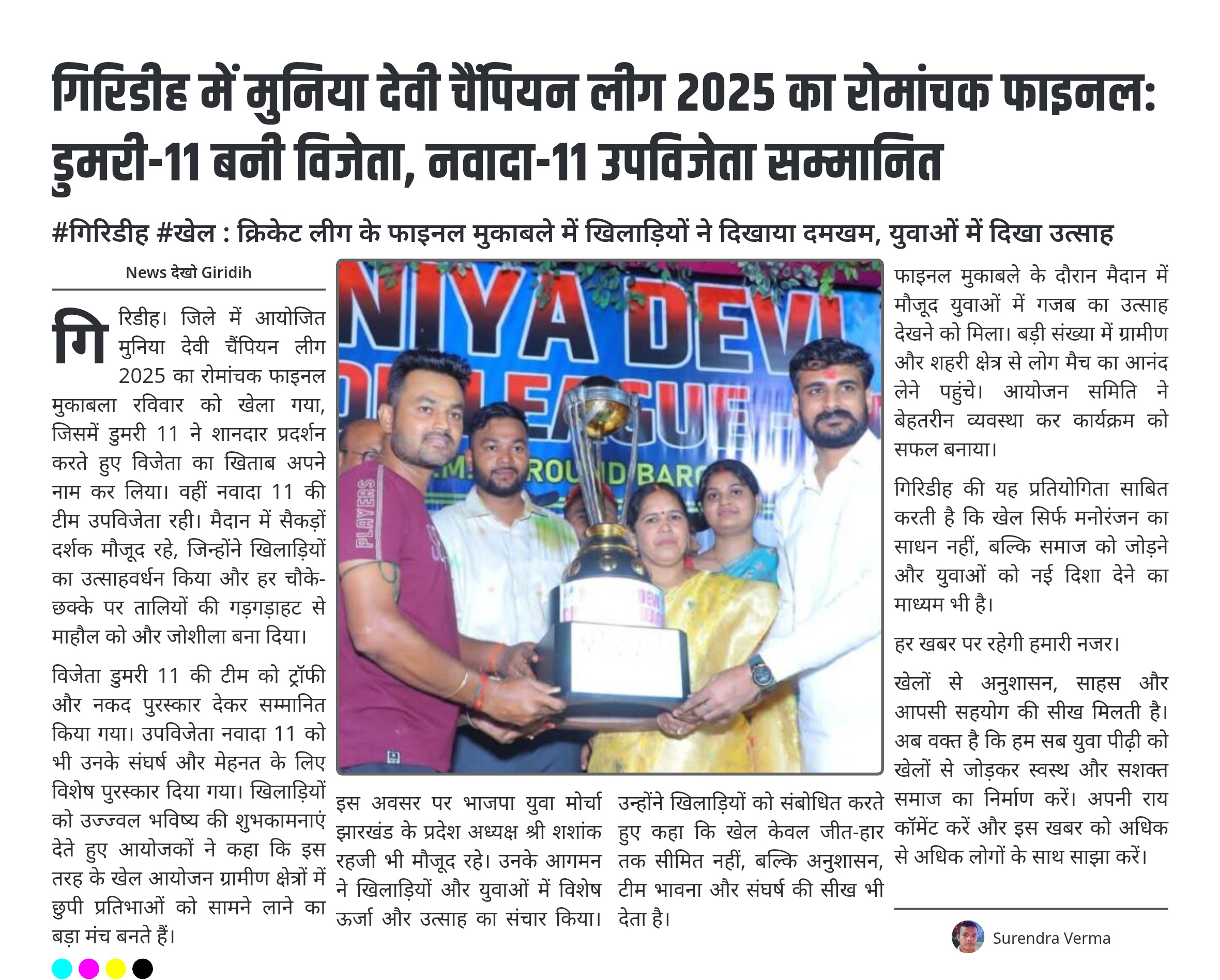 - डुमरी 11 ने जीता मुनिया देवी चैंपियन लीग 2025 का खिताब।