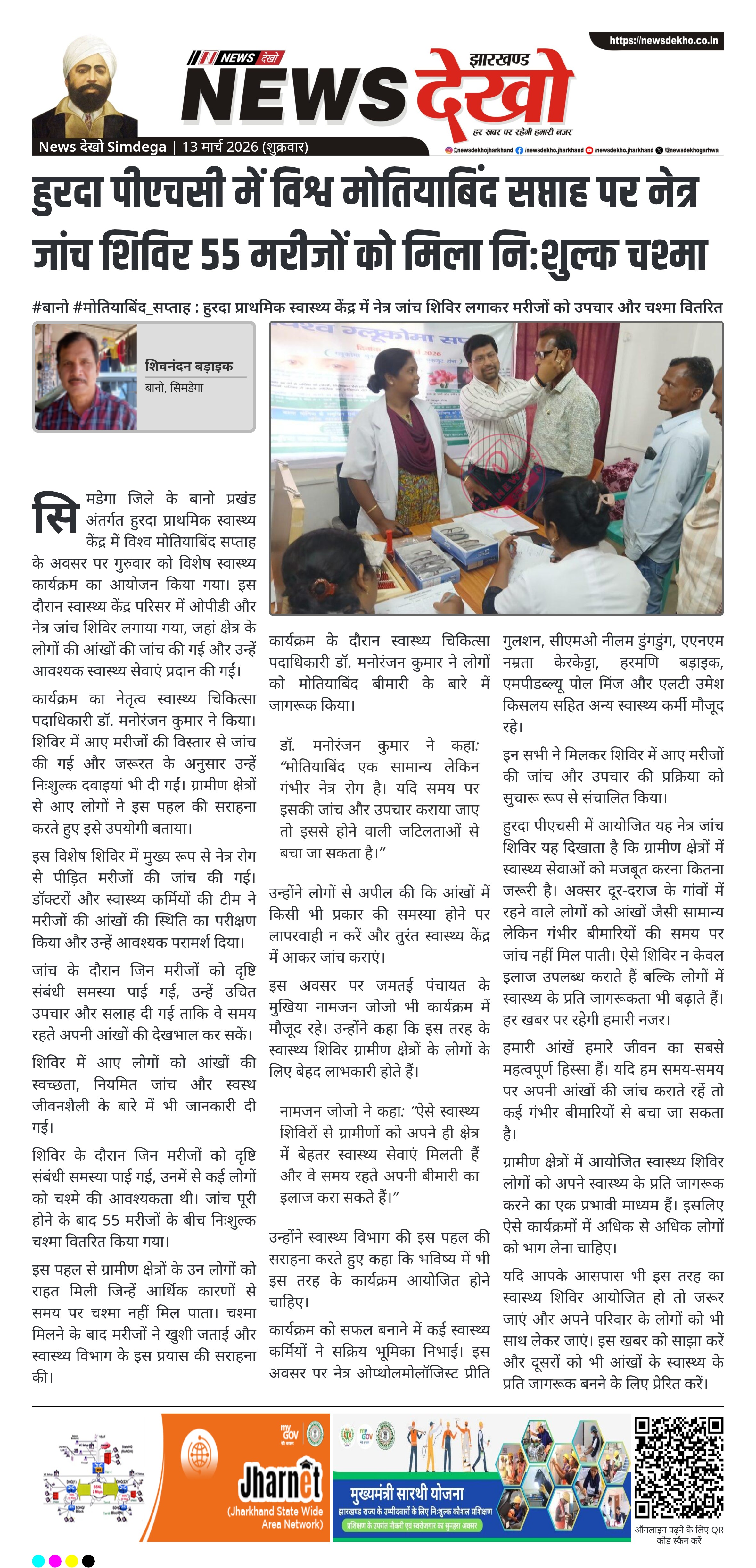 सिमडेगा जिले के बानो प्रखंड अंतर्गत हुरदा प्राथमिक स्वास्थ्य केंद्र में विश्व मोतियाबिंद सप्ताह के अवसर पर गुरुवार को विशेष स्वास्थ्य कार्यक्रम का आयोजन किया गया। इस दौरान स्वास्थ्य केंद्र परिसर में ओपीडी और नेत्र जांच शिविर लगाया गया, जहां क्षेत्र के लोगों की आंखों की जांच की गई और उन्हें आवश्यक स्वास्थ्य सेवाएं प्रदान की गईं।