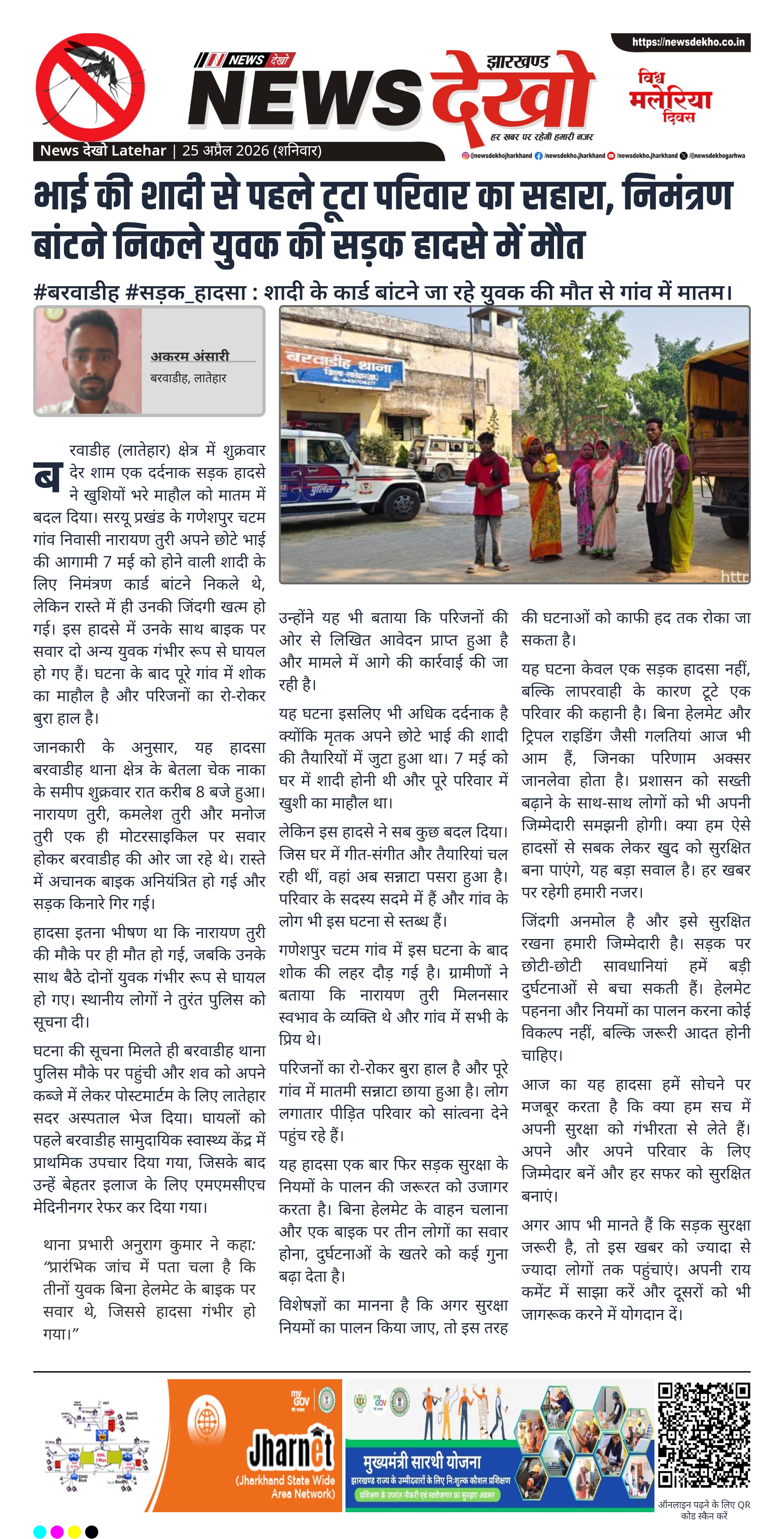 लातेहार जिले के बरवाडीह थाना क्षेत्र में शुक्रवार रात एक दर्दनाक सड़क हादसे में एक युवक की मौत हो गई, जो अपने छोटे भाई की शादी का निमंत्रण कार्ड बांटने निकला था। हादसे में दो अन्य युवक गंभीर रूप से घायल हुए हैं। घटना के बाद परिवार और गांव में शोक की लहर फैल गई है। यह हादसा सड़क सुरक्षा के प्रति लापरवाही की गंभीर तस्वीर भी सामने लाता है।