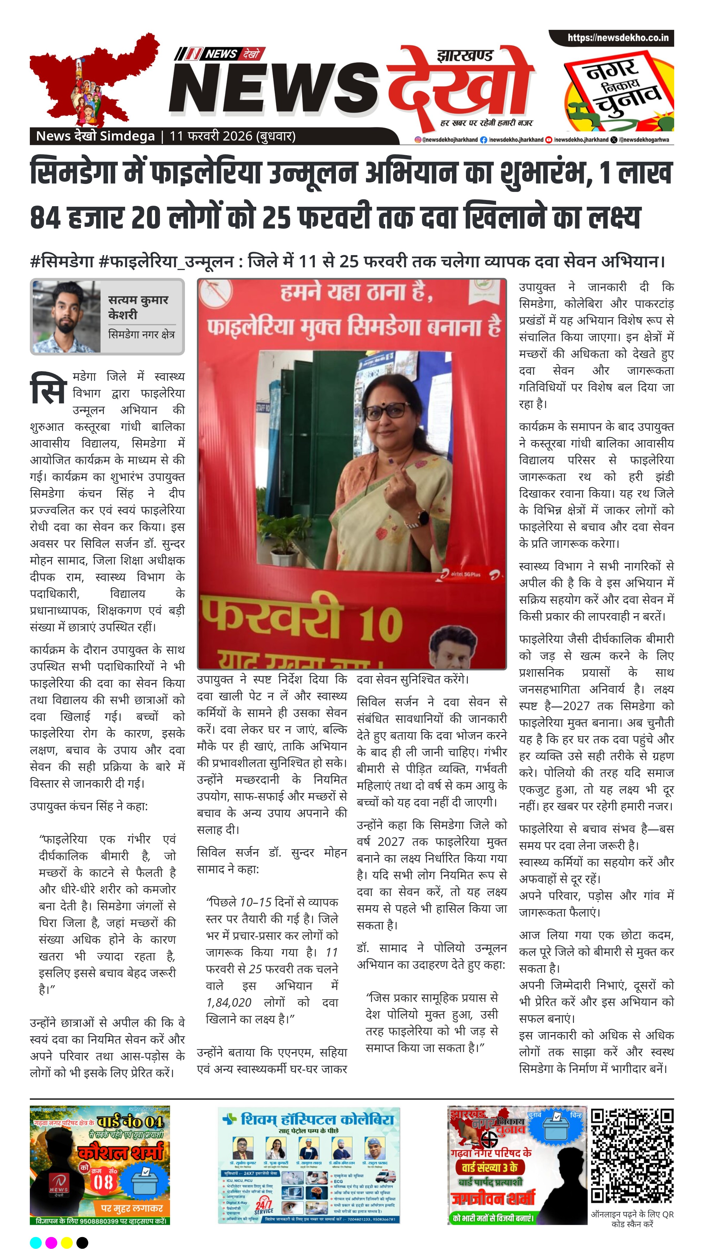 सिमडेगा जिले में फाइलेरिया उन्मूलन अभियान की औपचारिक शुरुआत कस्तूरबा गांधी बालिका आवासीय विद्यालय में उपायुक्त कंचन सिंह ने की। 11 से 25 फरवरी तक चलने वाले इस अभियान में 1,84,020 लोगों को फाइलेरिया रोधी दवा खिलाने का लक्ष्य है। स्वास्थ्य कर्मी घर-घर जाकर दवा सेवन सुनिश्चित करेंगे। वर्ष 2027 तक जिले को फाइलेरिया मुक्त बनाने का संकल्प दोहराया गया।