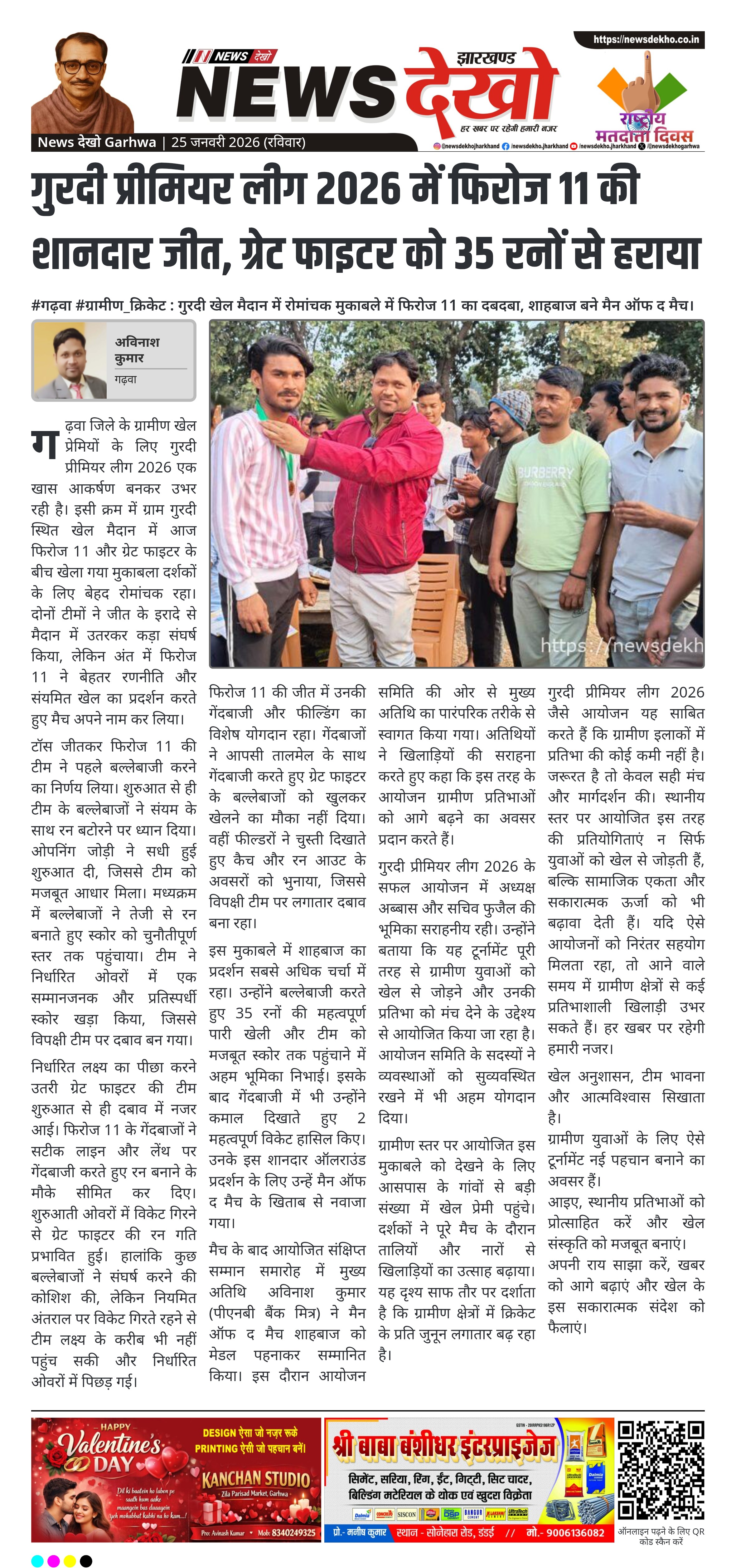 गढ़वा जिले के गुरदी गांव स्थित खेल मैदान में आयोजित गुरदी प्रीमियर लीग 2026 के तहत एक रोमांचक क्रिकेट मुकाबला खेला गया। फिरोज 11 और ग्रेट फाइटर के बीच हुए इस मैच में फिरोज 11 ने 35 रनों से शानदार जीत दर्ज की। मुकाबले में गेंदबाजी, बल्लेबाजी और फील्डिंग तीनों विभागों में फिरोज 11 का संतुलित प्रदर्शन देखने को मिला। ग्रामीण दर्शकों की भारी मौजूदगी के बीच यह मैच खेल भावना और उत्साह का प्रतीक बना।