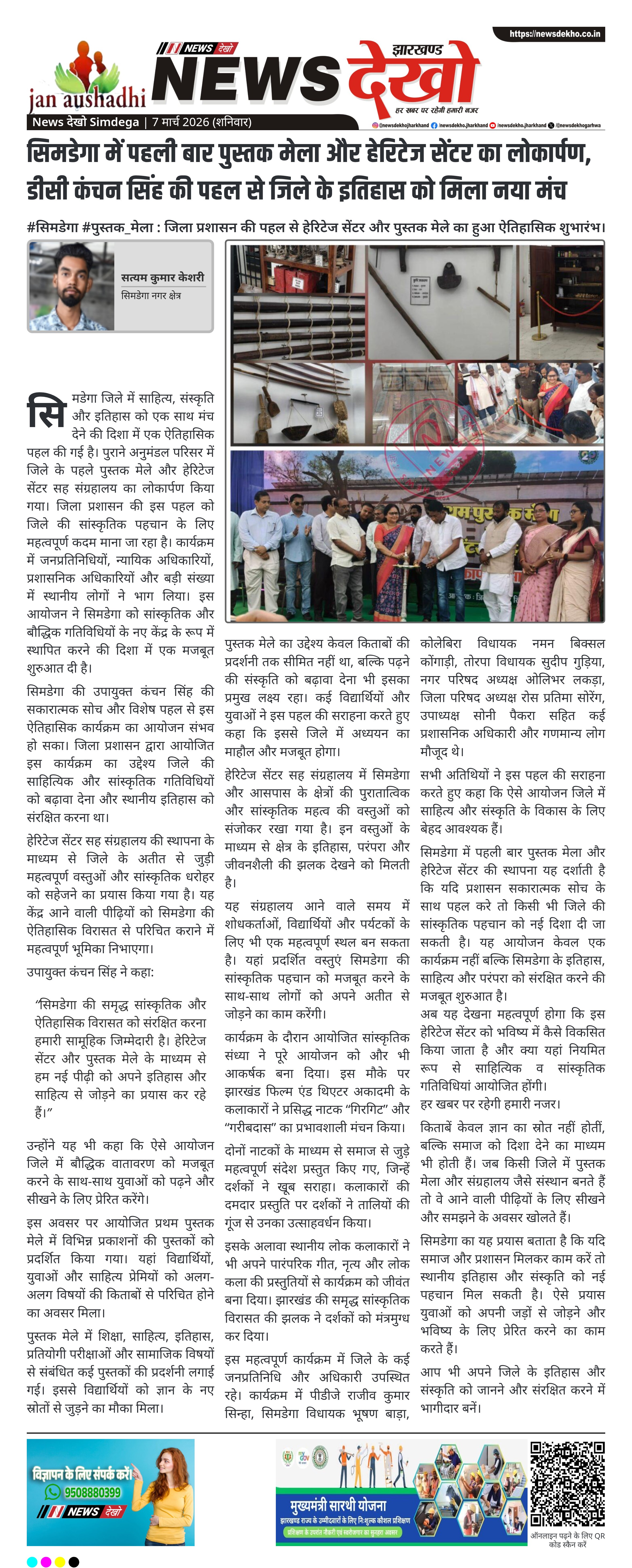 “सिमडेगा की समृद्ध सांस्कृतिक और ऐतिहासिक विरासत को संरक्षित करना हमारी सामूहिक जिम्मेदारी है। हेरिटेज सेंटर और पुस्तक मेले के माध्यम से हम नई पीढ़ी को अपने इतिहास और साहित्य से जोड़ने का प्रयास कर रहे हैं।”