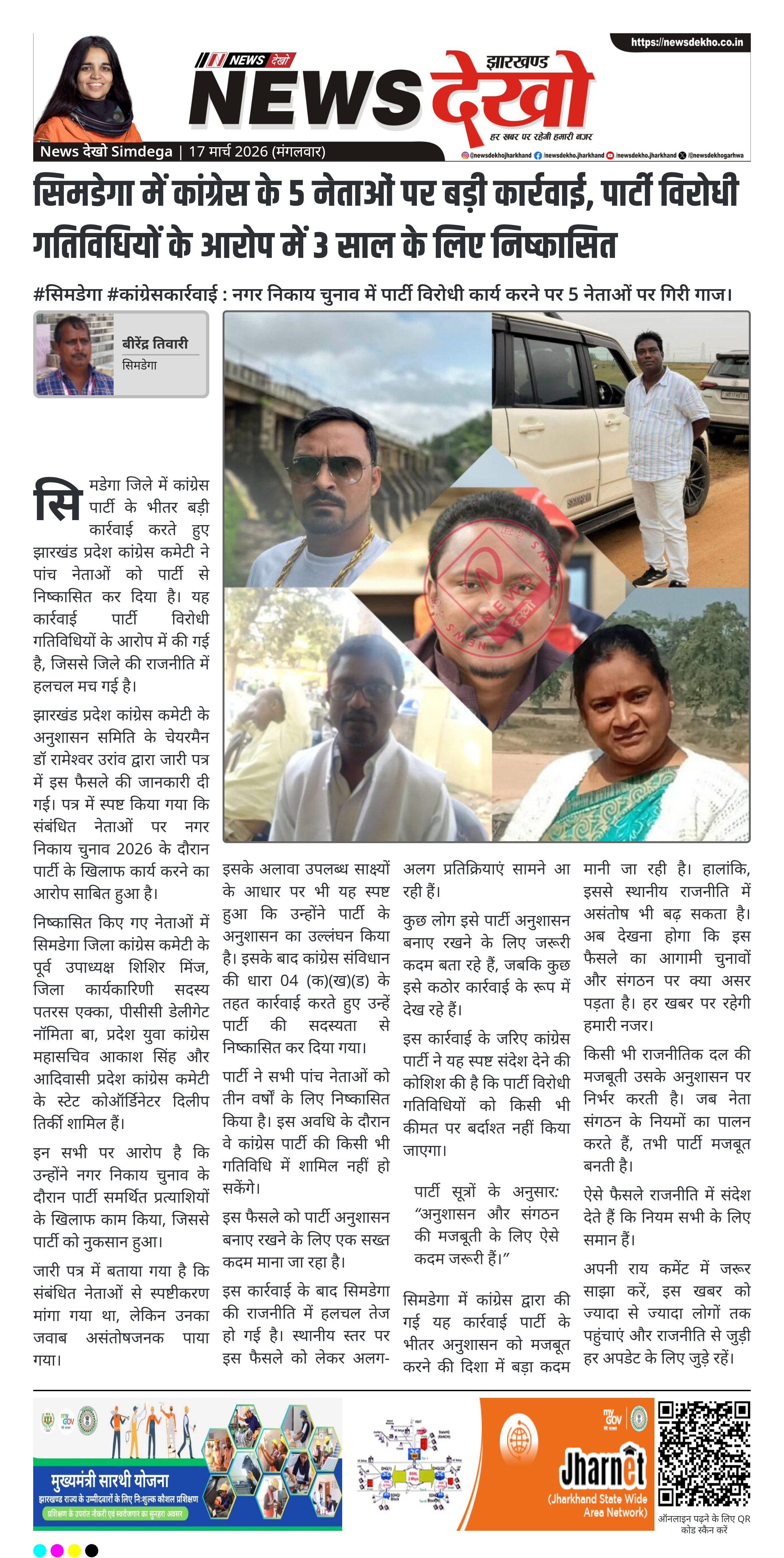 सिमडेगा में कांग्रेस द्वारा की गई यह कार्रवाई पार्टी के भीतर अनुशासन को मजबूत करने की दिशा में बड़ा कदम मानी जा रही है। हालांकि, इससे स्थानीय राजनीति में असंतोष भी बढ़ सकता है। अब देखना होगा कि इस फैसले का आगामी चुनावों और संगठन पर क्या असर पड़ता है। हर खबर पर रहेगी हमारी नजर।
