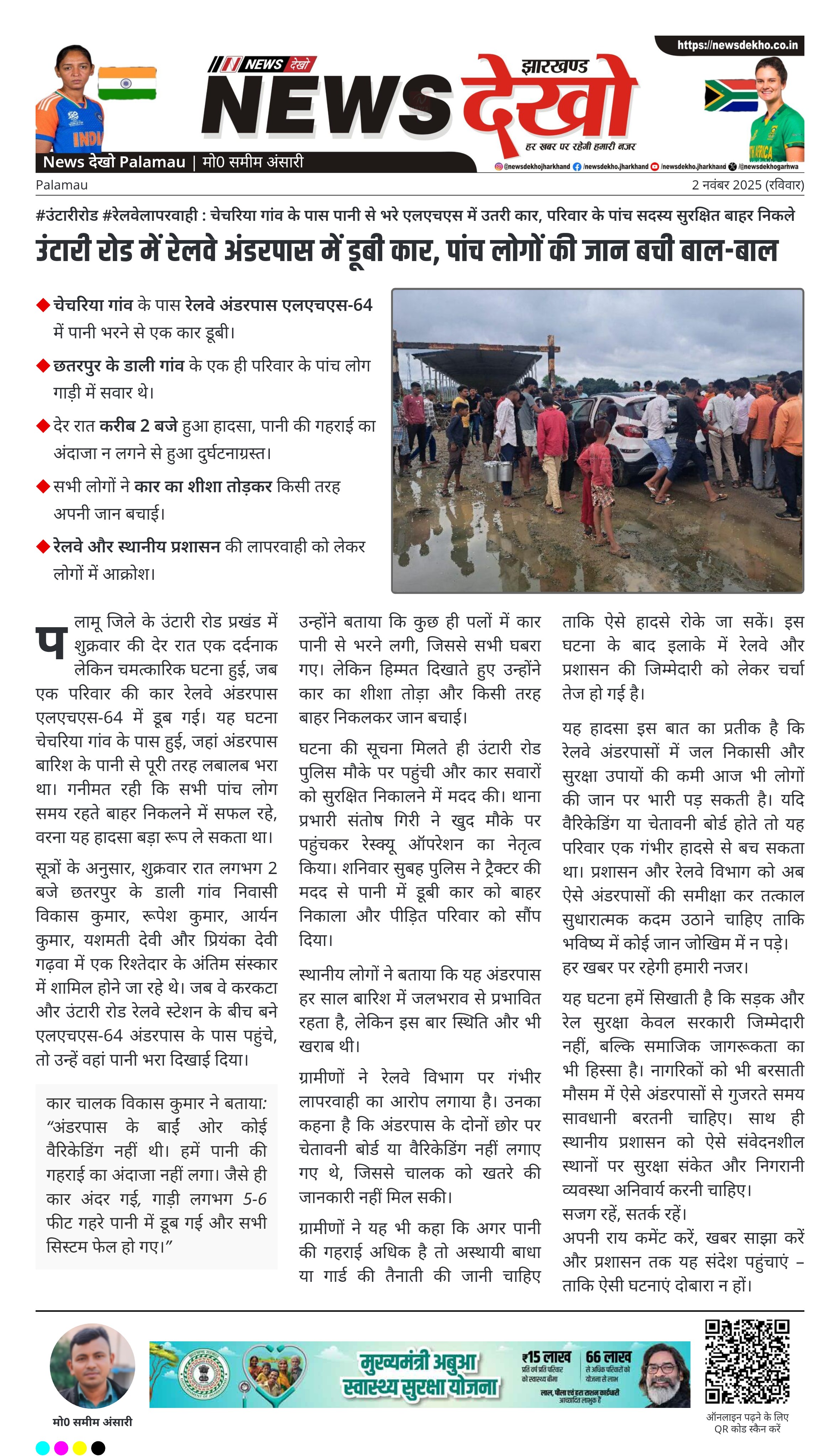 पलामू जिले के उंटारी रोड प्रखंड में शुक्रवार की देर रात एक दर्दनाक लेकिन चमत्कारिक घटना हुई, जब एक परिवार की कार रेलवे अंडरपास एलएचएस-64 में डूब गई। यह घटना चेचरिया गांव के पास हुई, जहां अंडरपास बारिश के पानी से पूरी तरह लबालब भरा था। गनीमत रही कि सभी पांच लोग समय रहते बाहर निकलने में सफल रहे, वरना यह हादसा बड़ा रूप ले सकता था।