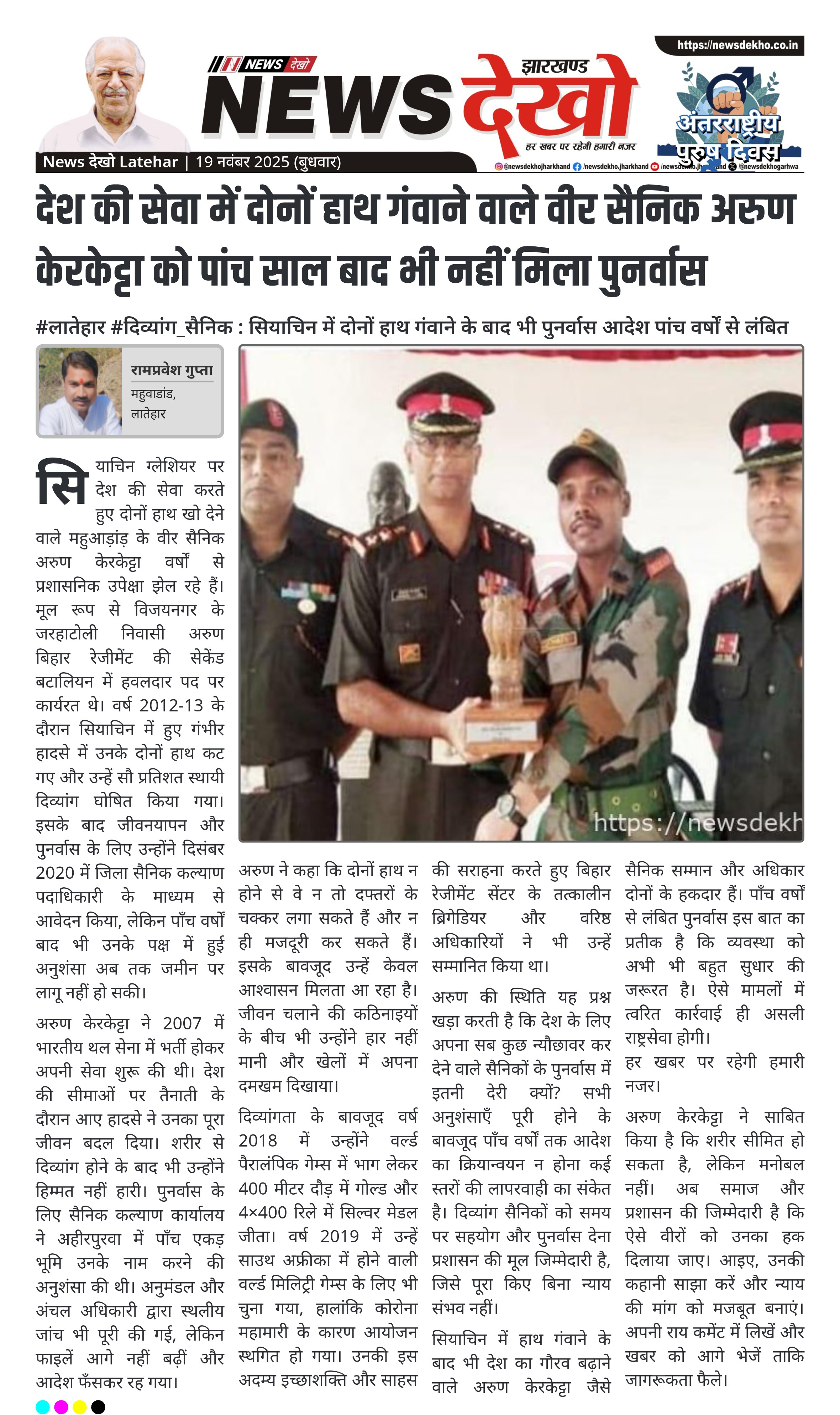 सियाचिन में हाथ गंवाने के बाद भी देश का गौरव बढ़ाने वाले अरुण केरकेट्टा जैसे सैनिक सम्मान और अधिकार दोनों के हकदार हैं। पाँच वर्षों से लंबित पुनर्वास इस बात का प्रतीक है कि व्यवस्था को अभी भी बहुत सुधार की जरूरत है। ऐसे मामलों में त्वरित कार्रवाई ही असली राष्ट्रसेवा होगी।