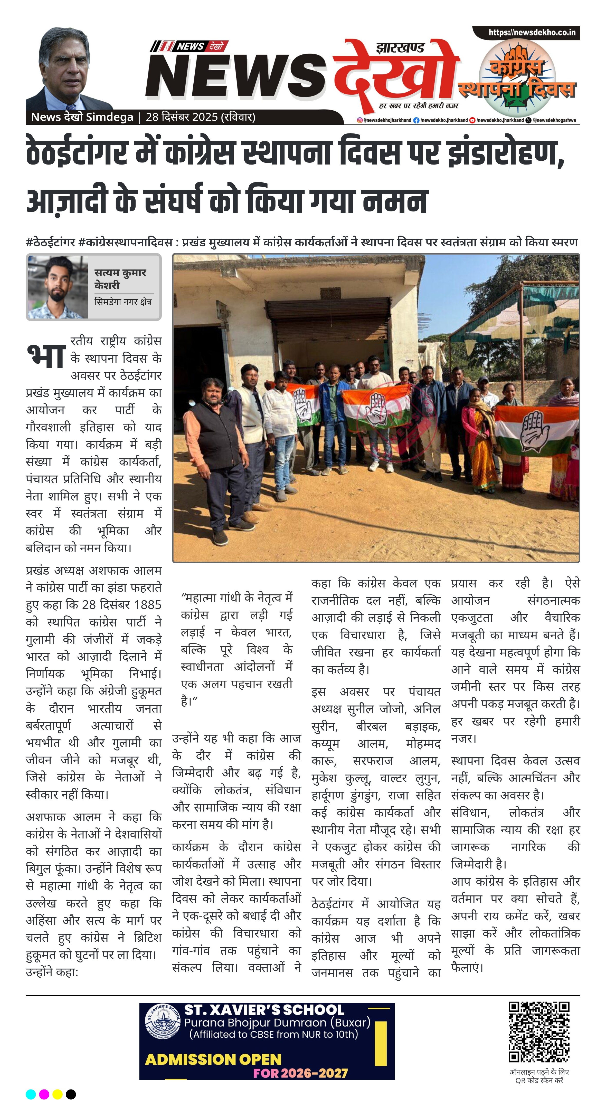 सिमडेगा जिले के ठेठईटांगर प्रखंड मुख्यालय में 28 दिसंबर को भारतीय राष्ट्रीय कांग्रेस का स्थापना दिवस हर्षोल्लास के साथ मनाया गया। इस अवसर पर कांग्रेस कार्यकर्ताओं ने झंडारोहण कर स्वतंत्रता संग्राम के महान नेताओं को नमन किया। कार्यक्रम का नेतृत्व प्रखंड अध्यक्ष अशफाक आलम ने किया। आयोजन के माध्यम से कांग्रेस की ऐतिहासिक भूमिका और लोकतांत्रिक मूल्यों को दोहराया गया।