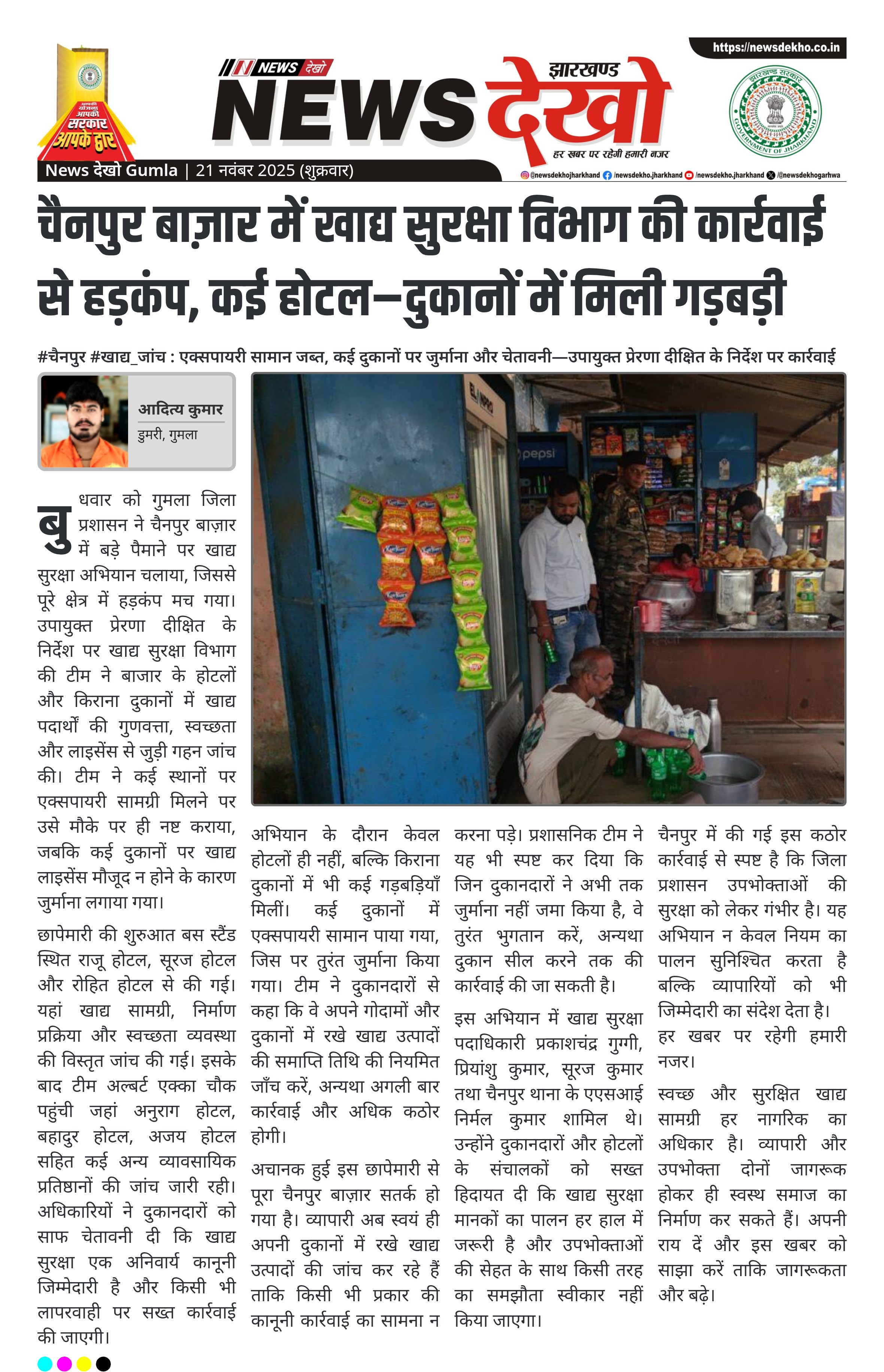 बुधवार को गुमला जिला प्रशासन ने चैनपुर बाज़ार में बड़े पैमाने पर खाद्य सुरक्षा अभियान चलाया, जिससे पूरे क्षेत्र में हड़कंप मच गया। उपायुक्त प्रेरणा दीक्षित के निर्देश पर खाद्य सुरक्षा विभाग की टीम ने बाजार के होटलों और किराना दुकानों में खाद्य पदार्थों की गुणवत्ता, स्वच्छता और लाइसेंस से जुड़ी गहन जांच की। टीम ने कई स्थानों पर एक्सपायरी सामग्री मिलने पर उसे मौके पर ही नष्ट कराया, जबकि कई दुकानों पर खाद्य लाइसेंस मौजूद न होने के कारण जुर्माना लगाया गया।
