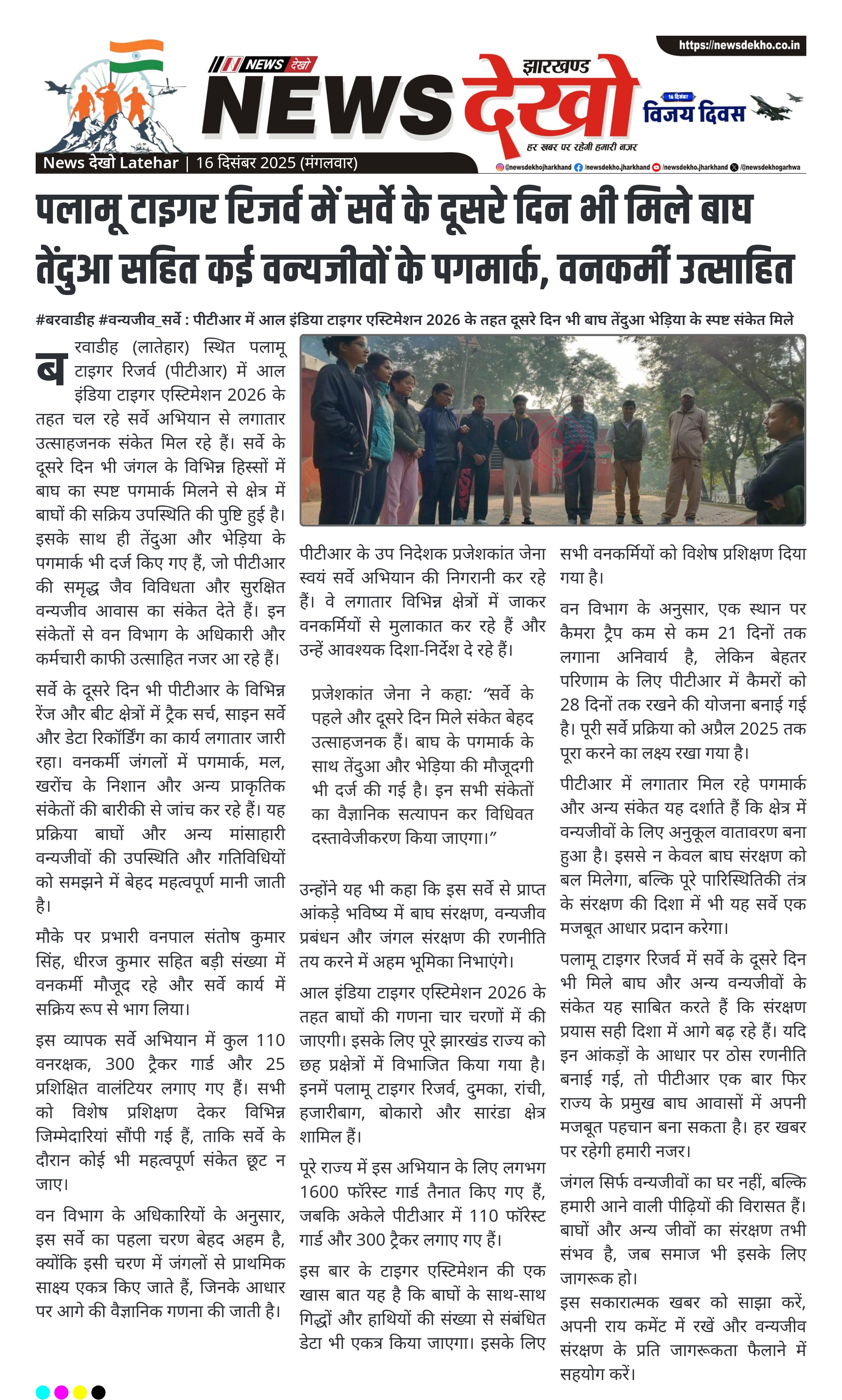 - पलामू टाइगर रिजर्व में सर्वे के दूसरे दिन भी बाघ का स्पष्ट पगमार्क मिला।
