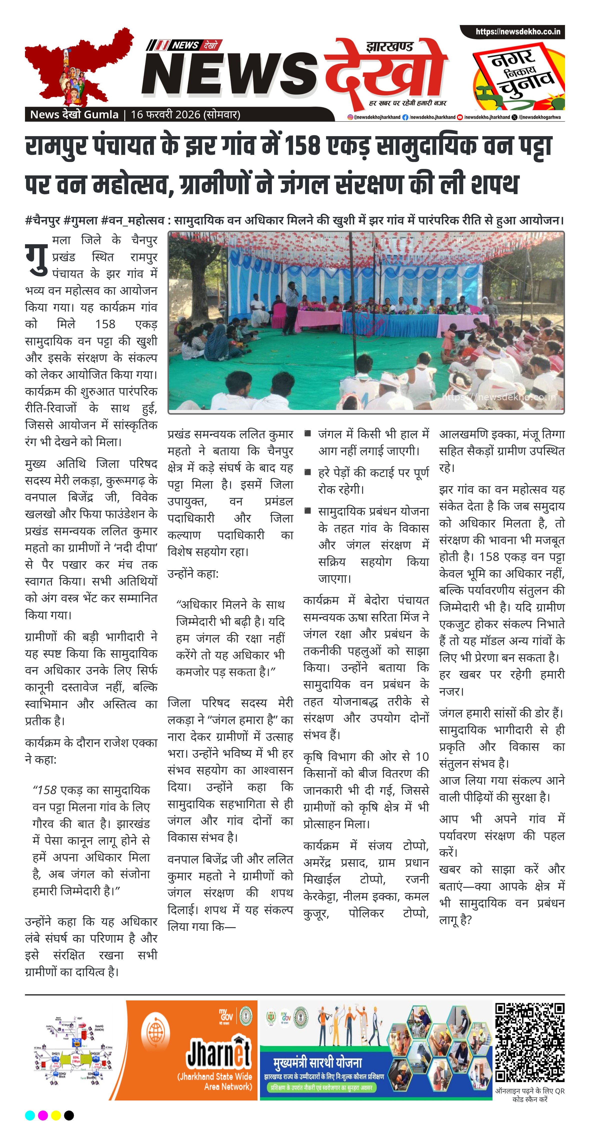गुमला जिले के चैनपुर प्रखंड स्थित रामपुर पंचायत के झर गांव में भव्य वन महोत्सव का आयोजन किया गया। यह कार्यक्रम गांव को मिले 158 एकड़ सामुदायिक वन पट्टा की खुशी और इसके संरक्षण के संकल्प को लेकर आयोजित किया गया। कार्यक्रम की शुरुआत पारंपरिक रीति-रिवाजों के साथ हुई, जिससे आयोजन में सांस्कृतिक रंग भी देखने को मिला।