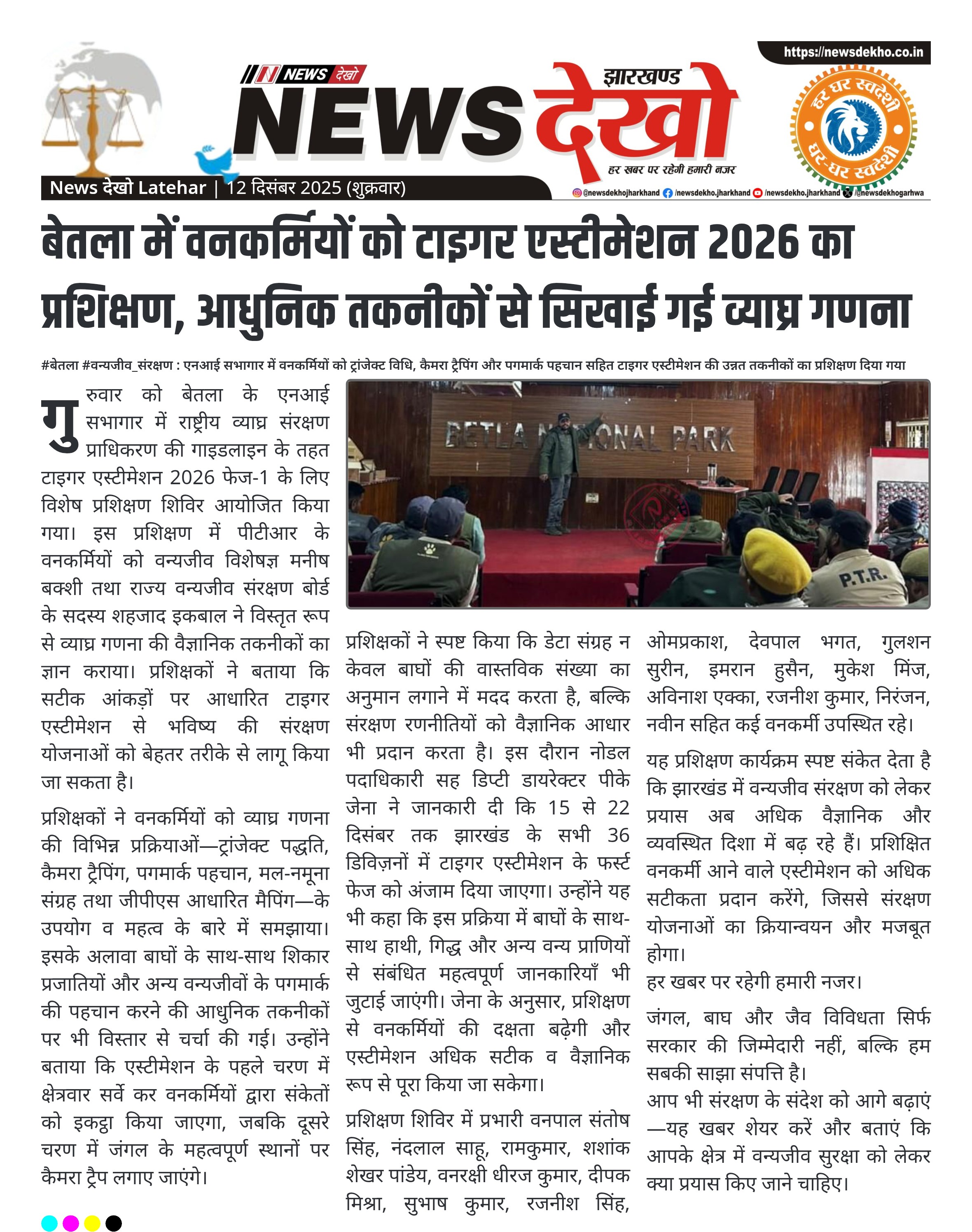 - बेतला एनआई सभागार में टाइगर एस्टीमेशन 2026 फेज-1 का विशेष प्रशिक्षण आयोजित किया गया।