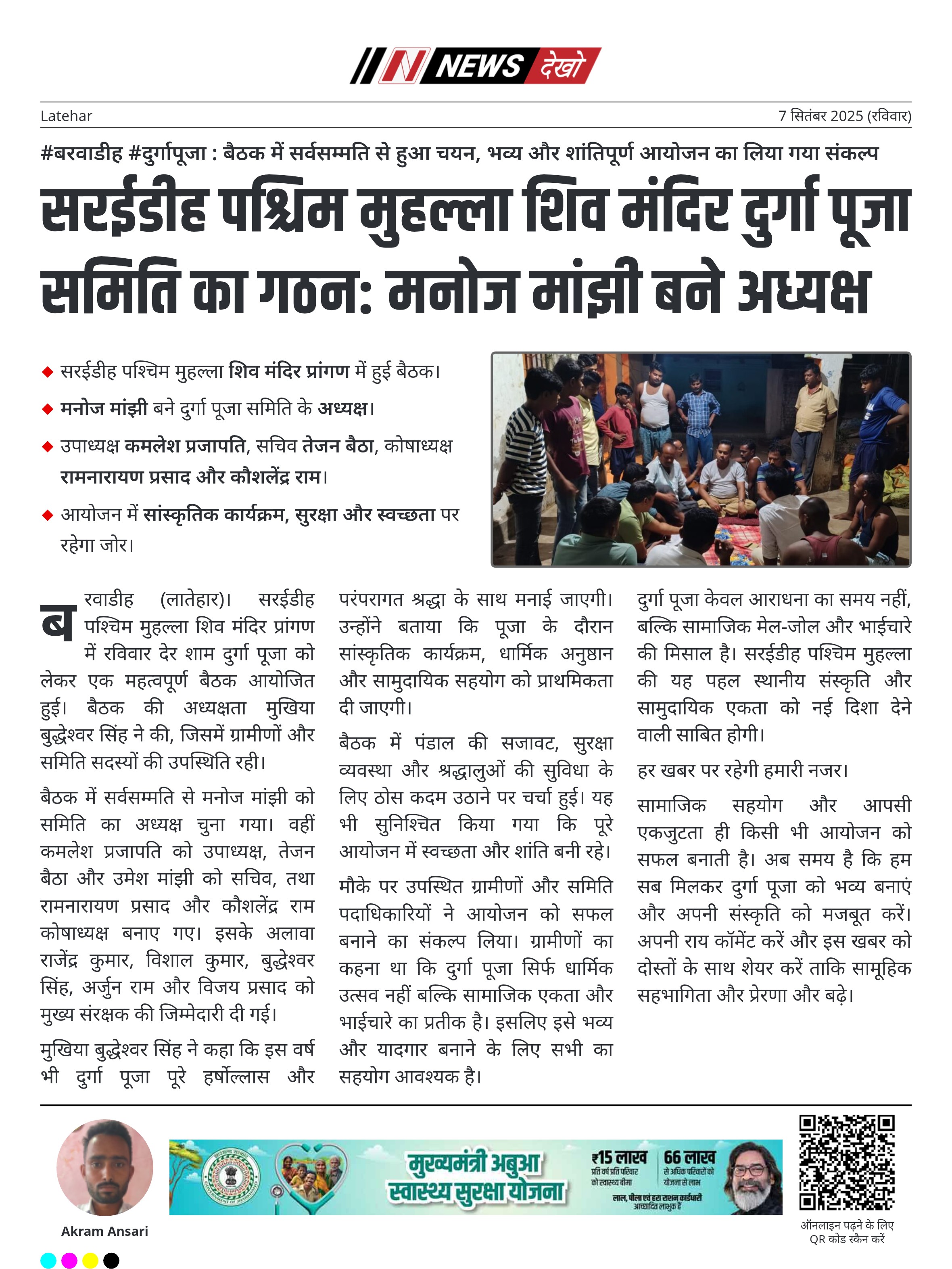 दुर्गा पूजा केवल आराधना का समय नहीं, बल्कि सामाजिक मेल-जोल और भाईचारे की मिसाल है। सरईडीह पश्चिम मुहल्ला की यह पहल स्थानीय संस्कृति और सामुदायिक एकता को नई दिशा देने वाली साबित होगी।