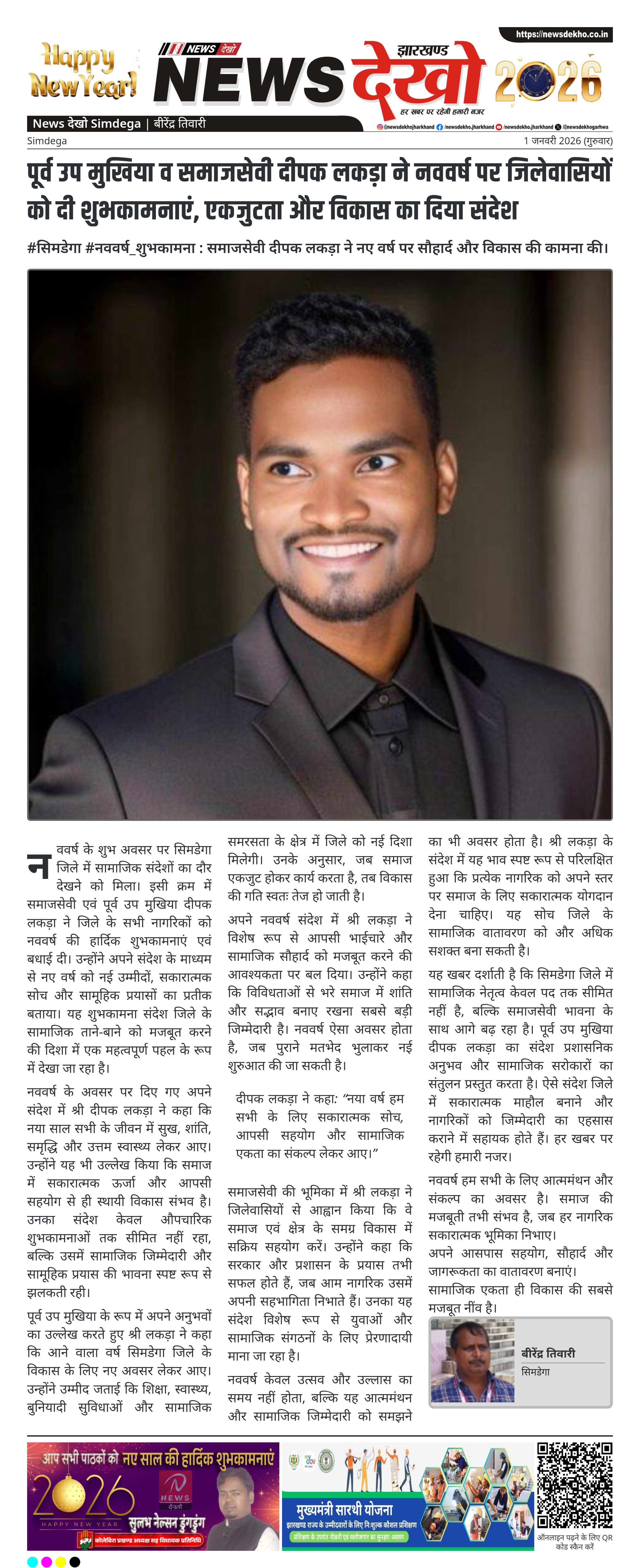 #सिमडेगा #नववर्ष_शुभकामना : समाजसेवी दीपक लकड़ा ने नए वर्ष पर सौहार्द और विकास की कामना की।