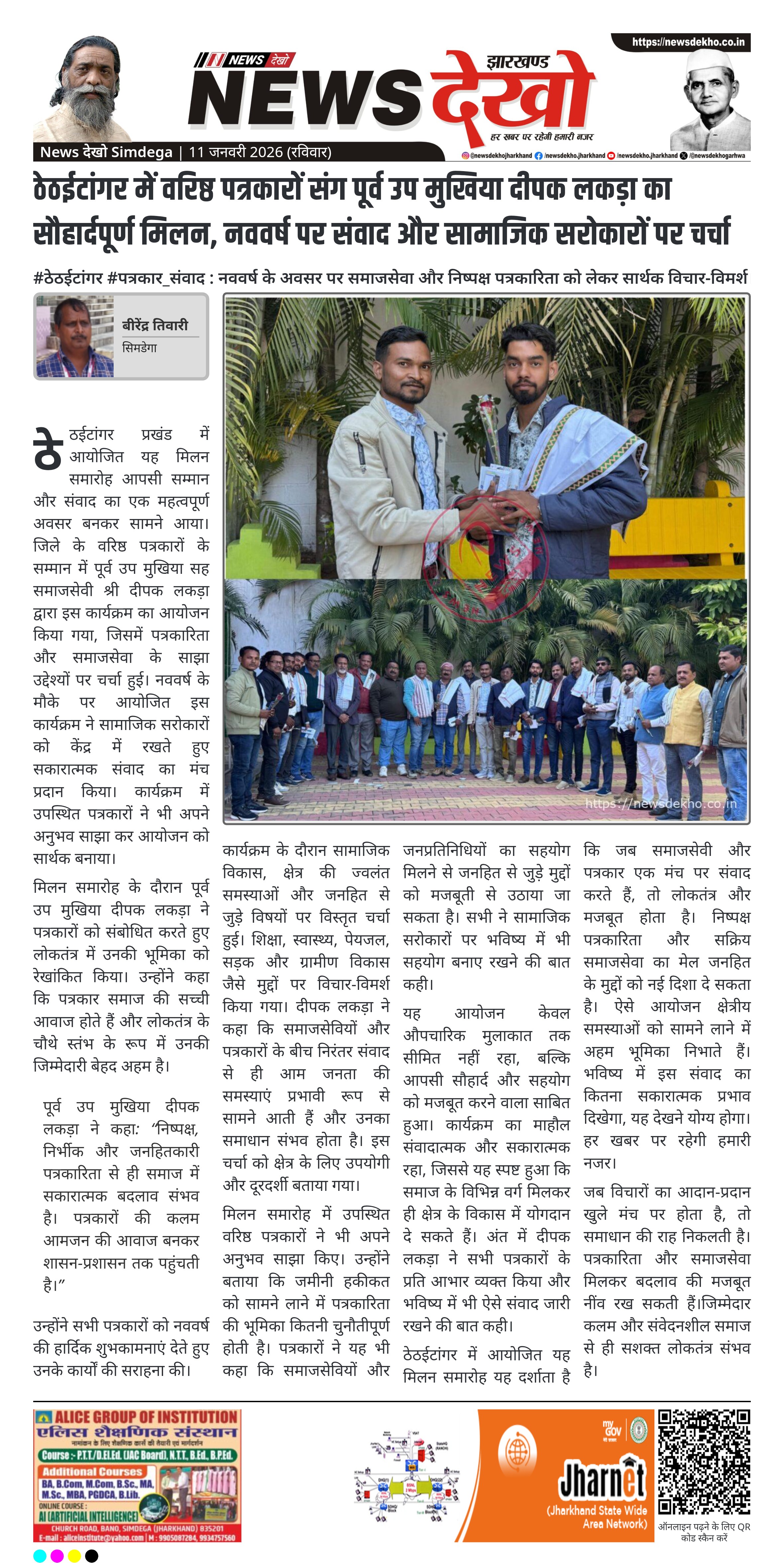 सिमडेगा जिले के ठेठईटांगर में पूर्व उप मुखिया एवं समाजसेवी दीपक लकड़ा द्वारा वरिष्ठ पत्रकारों के सम्मान में सौहार्दपूर्ण मिलन समारोह आयोजित किया गया। नववर्ष के अवसर पर आयोजित इस कार्यक्रम में जिले के अनुभवी पत्रकारों ने सहभागिता की। समारोह के दौरान लोकतंत्र में पत्रकारिता की भूमिका और सामाजिक सरोकारों पर गहन चर्चा हुई। आयोजन का उद्देश्य संवाद, सहयोग और जनहित के मुद्दों को सशक्त बनाना रहा।