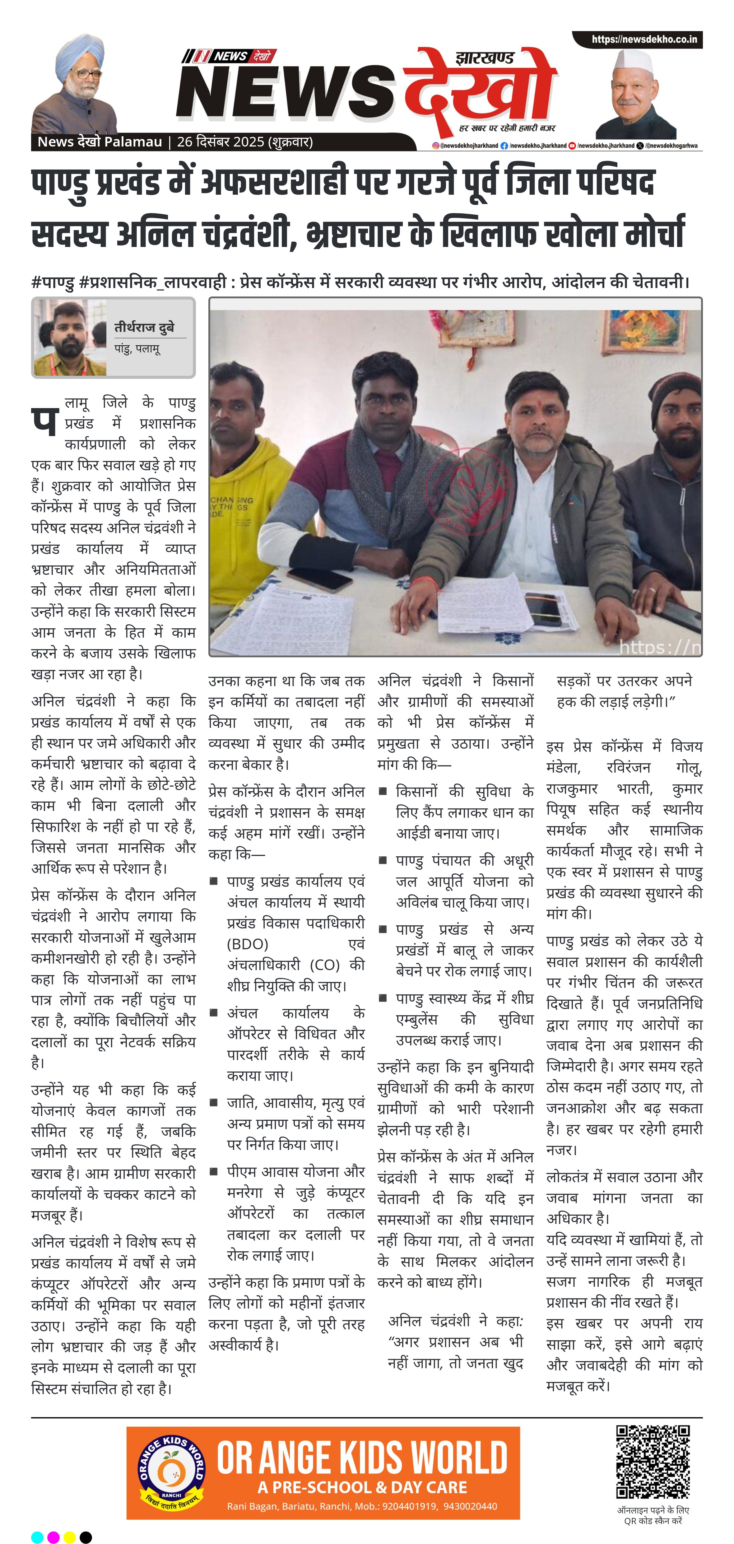 पलामू जिले के पाण्डु प्रखंड में प्रशासनिक कार्यप्रणाली को लेकर एक बार फिर सवाल खड़े हो गए हैं। शुक्रवार को आयोजित प्रेस कॉन्फ्रेंस में पाण्डु के पूर्व जिला परिषद सदस्य अनिल चंद्रवंशी ने प्रखंड कार्यालय में व्याप्त भ्रष्टाचार और अनियमितताओं को लेकर तीखा हमला बोला। उन्होंने कहा कि सरकारी सिस्टम आम जनता के हित में काम करने के बजाय उसके खिलाफ खड़ा नजर आ रहा है।