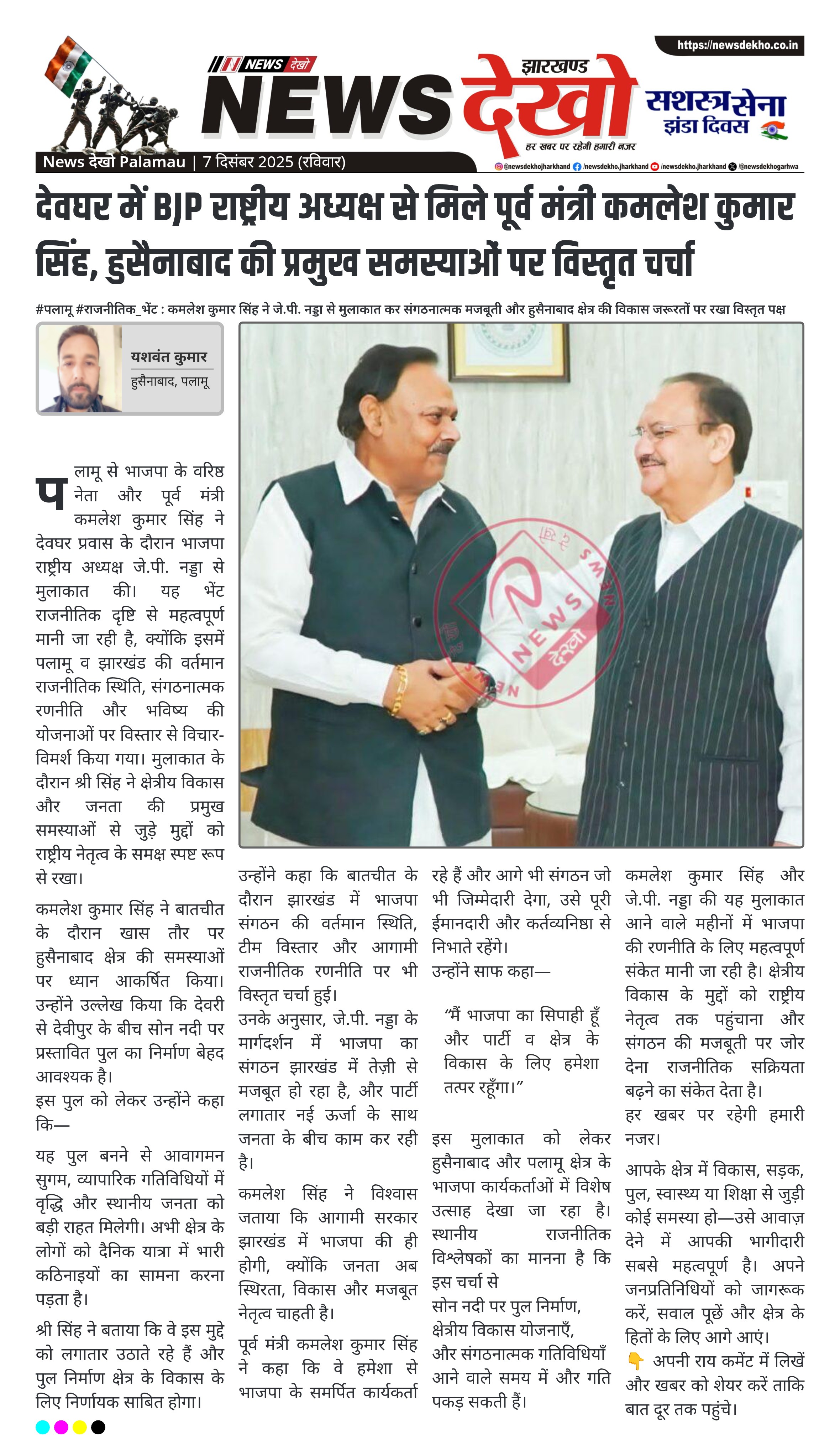 #पलामू #राजनीतिक_भेंट : कमलेश कुमार सिंह ने जे.पी. नड्डा से मुलाकात कर संगठनात्मक मजबूती और हुसैनाबाद क्षेत्र की विकास जरूरतों पर रखा विस्तृत पक्ष