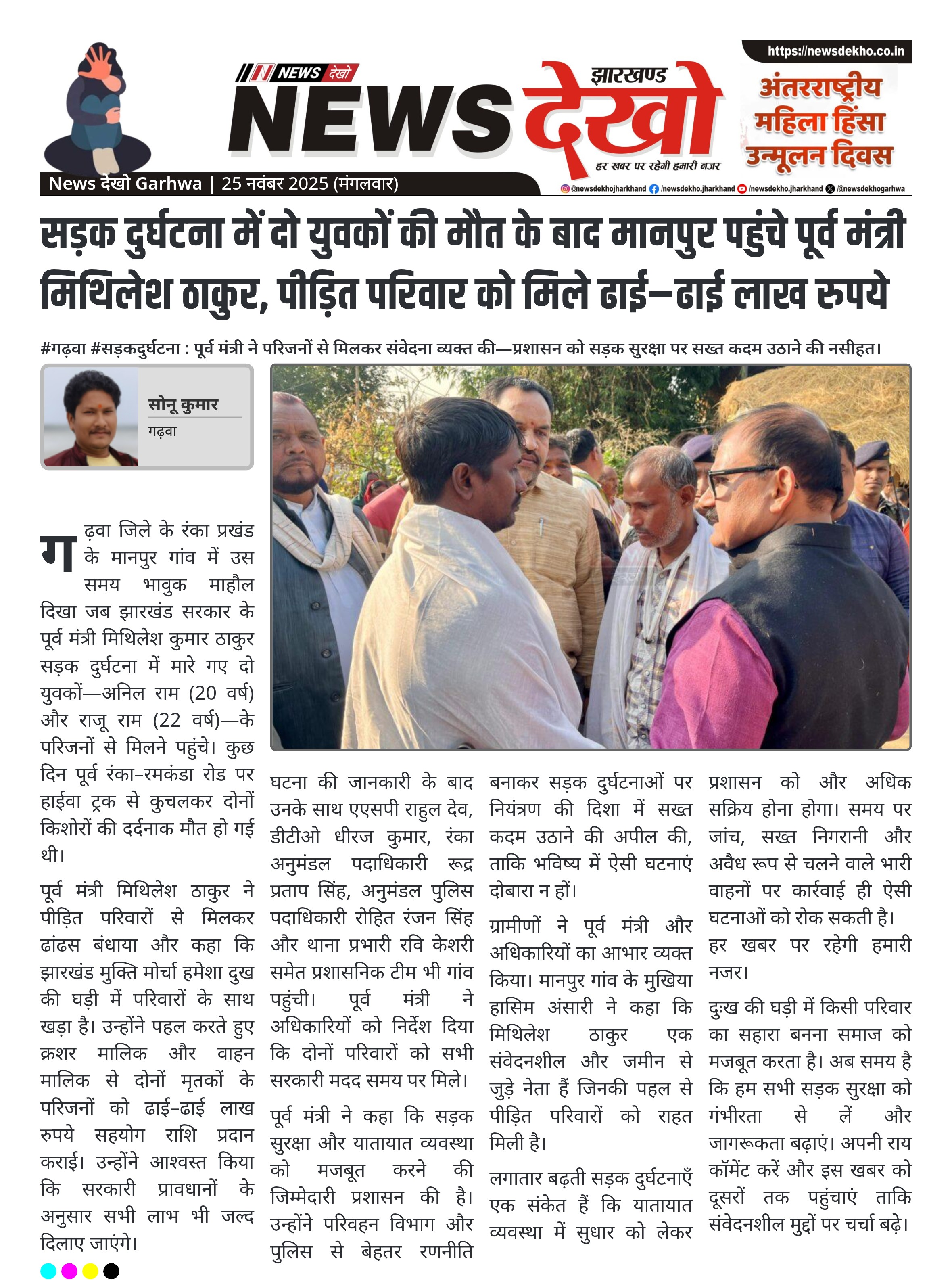 गढ़वा जिले के रंका प्रखंड के मानपुर गांव में उस समय भावुक माहौल दिखा जब झारखंड सरकार के पूर्व मंत्री मिथिलेश कुमार ठाकुर सड़क दुर्घटना में मारे गए दो युवकों—अनिल राम (20 वर्ष) और राजू राम (22 वर्ष)—के परिजनों से मिलने पहुंचे। कुछ दिन पूर्व रंका–रमकंडा रोड पर हाईवा ट्रक से कुचलकर दोनों किशोरों की दर्दनाक मौत हो गई थी।