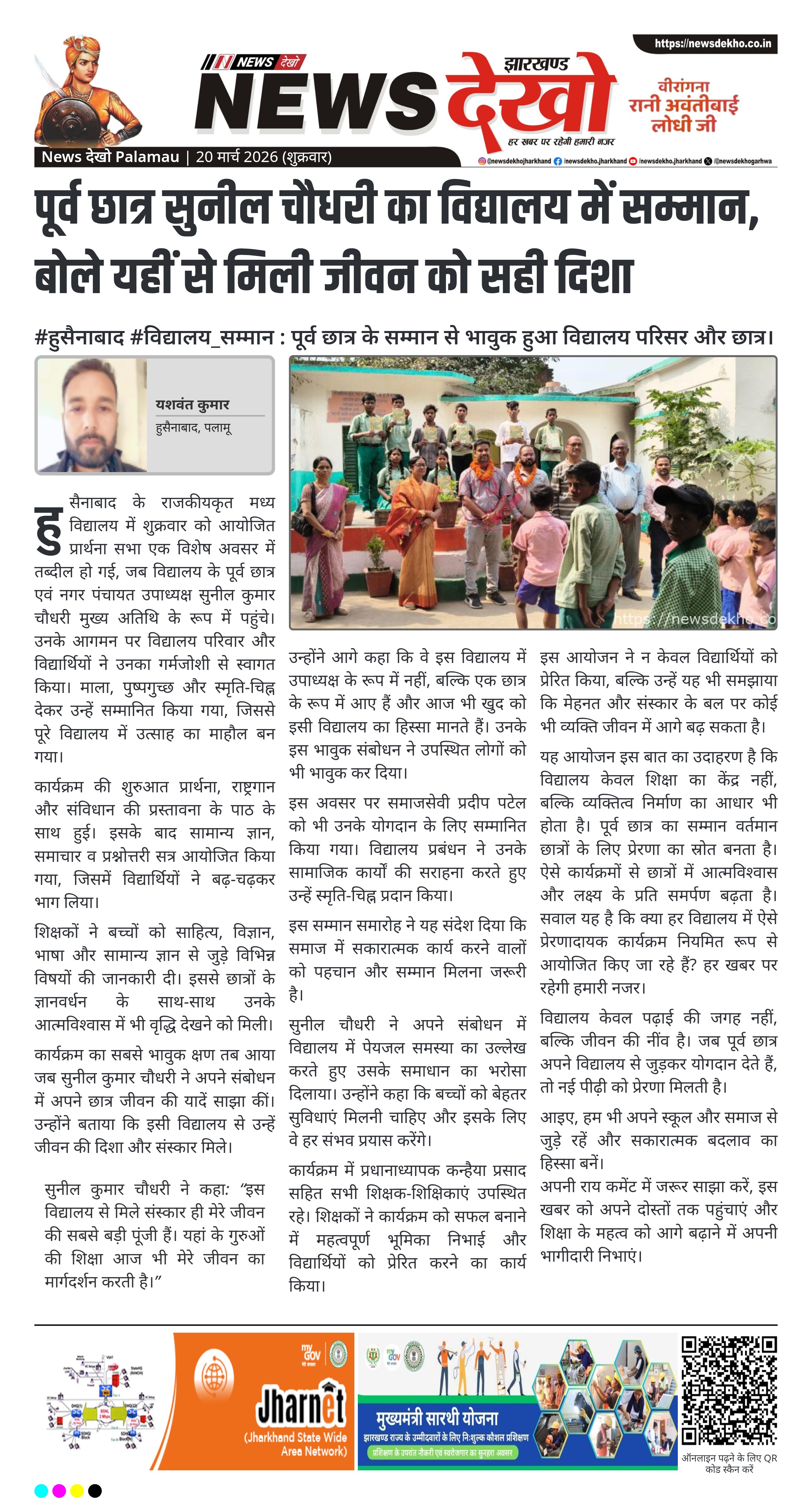 पलामू के हुसैनाबाद स्थित राजकीयकृत मध्य विद्यालय में शुक्रवार को आयोजित कार्यक्रम में पूर्व छात्र एवं नगर पंचायत उपाध्यक्ष सुनील कुमार चौधरी को सम्मानित किया गया। इस दौरान उन्होंने अपने छात्र जीवन की यादें साझा करते हुए विद्यालय के प्रति भावनात्मक जुड़ाव व्यक्त किया। कार्यक्रम में विद्यार्थियों ने सक्रिय भागीदारी दिखाई और शैक्षणिक गतिविधियों का आयोजन किया गया। यह आयोजन शिक्षा और संस्कार के महत्व को दर्शाता है।