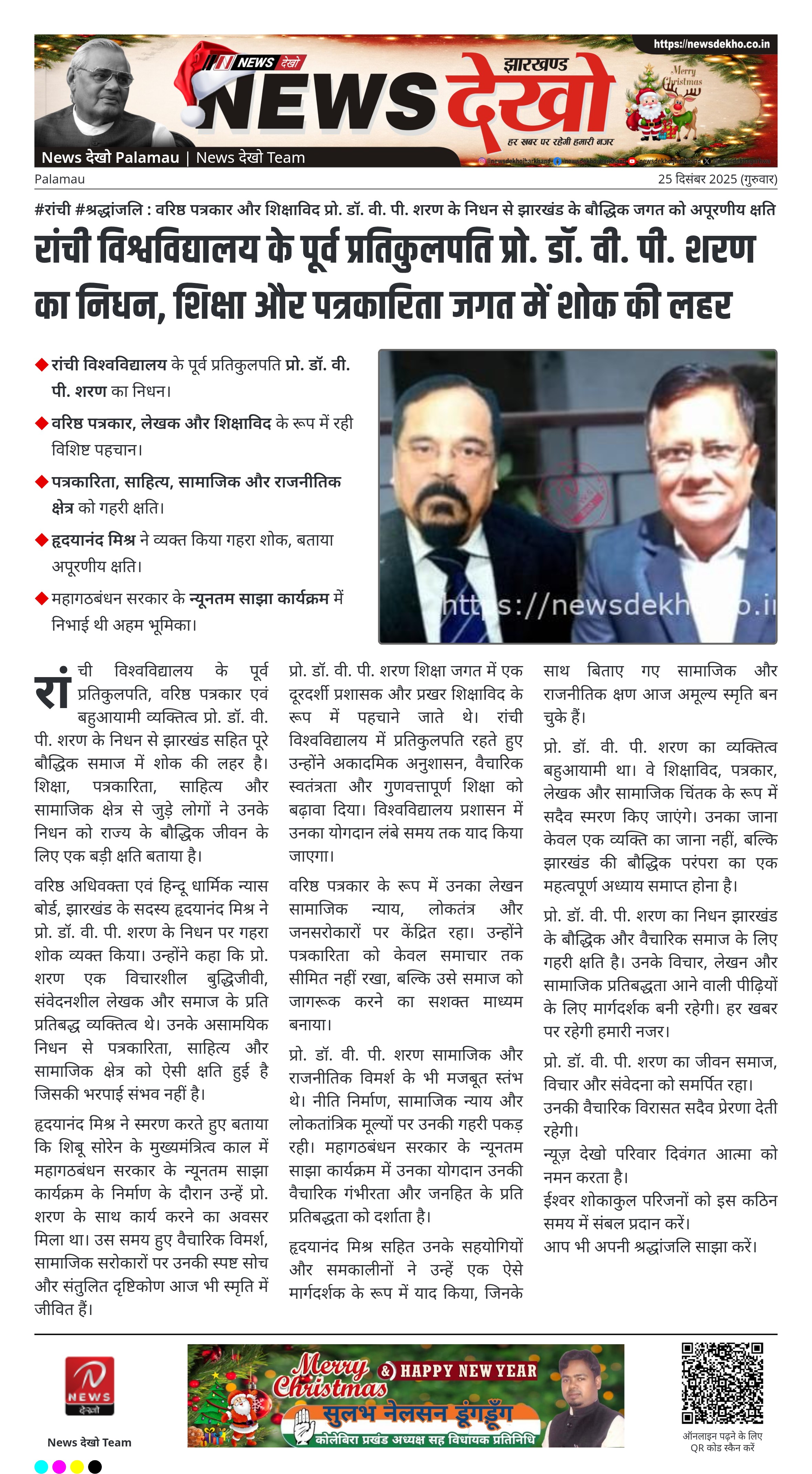 रांची विश्वविद्यालय के पूर्व प्रतिकुलपति, वरिष्ठ पत्रकार एवं बहुआयामी व्यक्तित्व प्रो. डॉ. वी. पी. शरण के निधन से झारखंड सहित पूरे बौद्धिक समाज में शोक की लहर है। शिक्षा, पत्रकारिता, साहित्य और सामाजिक क्षेत्र से जुड़े लोगों ने उनके निधन को राज्य के बौद्धिक जीवन के लिए एक बड़ी क्षति बताया है।