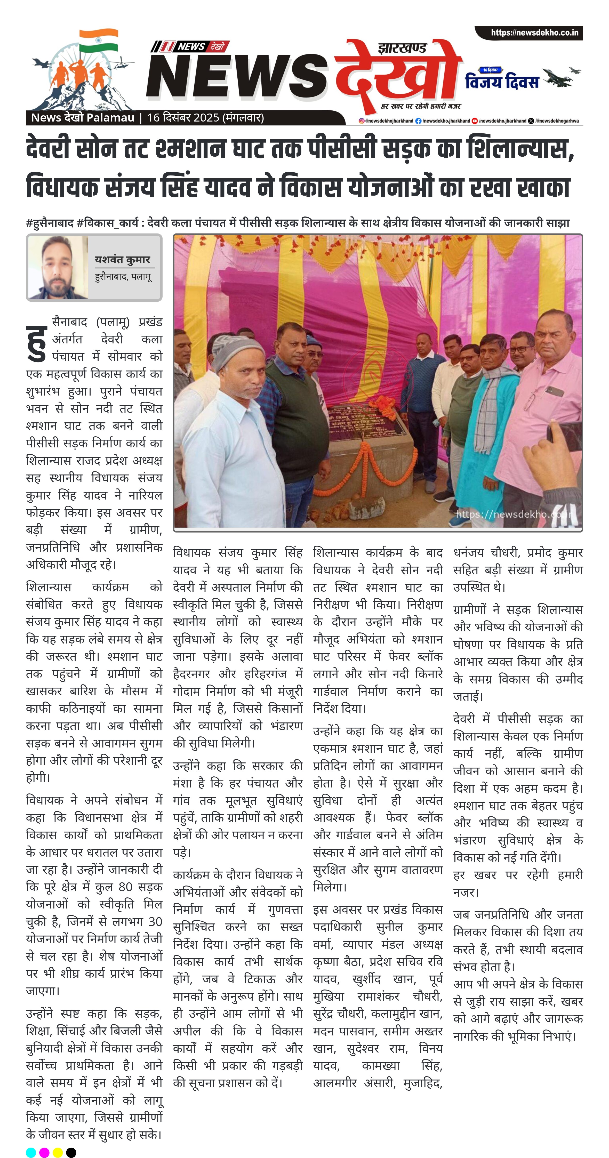 हुसैनाबाद (पलामू) प्रखंड अंतर्गत देवरी कला पंचायत में सोमवार को एक महत्वपूर्ण विकास कार्य का शुभारंभ हुआ। पुराने पंचायत भवन से सोन नदी तट स्थित श्मशान घाट तक बनने वाली पीसीसी सड़क निर्माण कार्य का शिलान्यास राजद प्रदेश अध्यक्ष सह स्थानीय विधायक संजय कुमार सिंह यादव ने नारियल फोड़कर किया। इस अवसर पर बड़ी संख्या में ग्रामीण, जनप्रतिनिधि और प्रशासनिक अधिकारी मौजूद रहे।