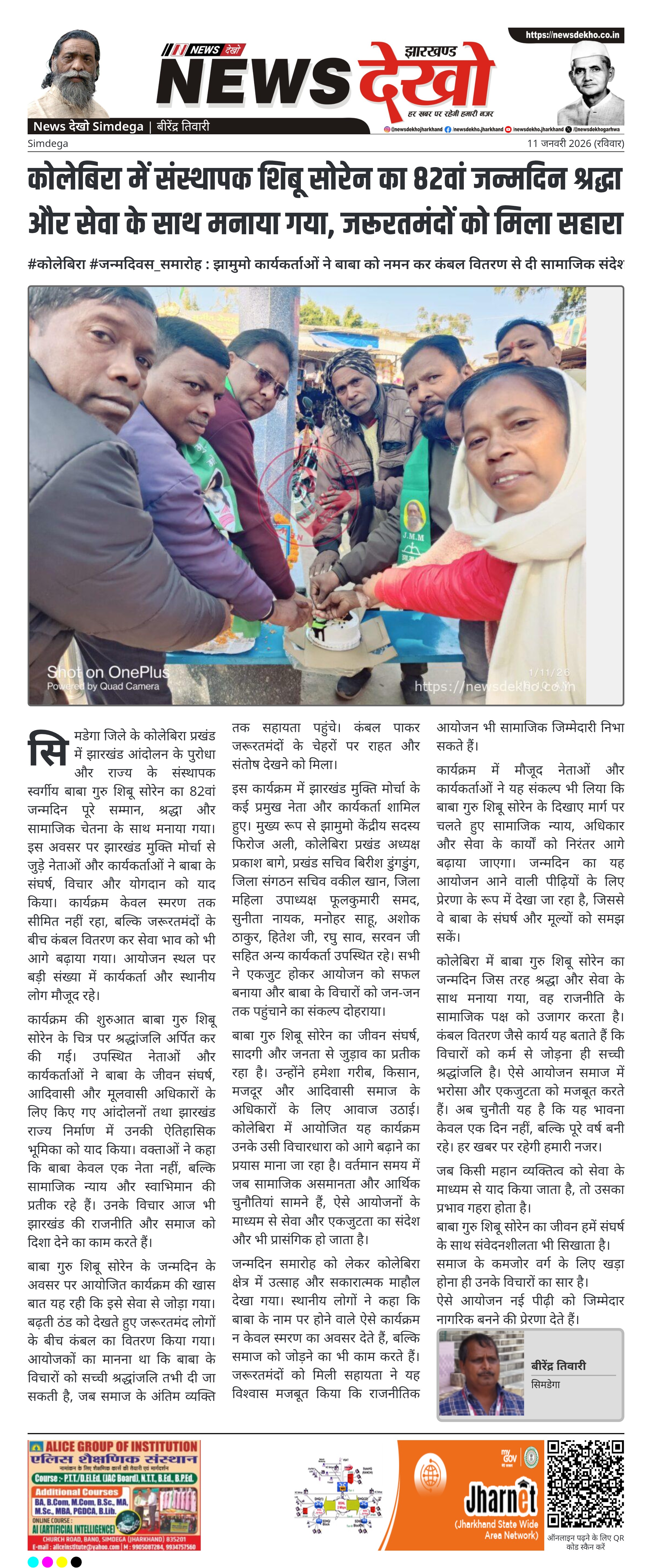 सिमडेगा जिले के कोलेबिरा प्रखंड में झारखंड आंदोलन के पुरोधा और राज्य के संस्थापक स्वर्गीय बाबा गुरु शिबू सोरेन का 82वां जन्मदिन पूरे सम्मान, श्रद्धा और सामाजिक चेतना के साथ मनाया गया। इस अवसर पर झारखंड मुक्ति मोर्चा से जुड़े नेताओं और कार्यकर्ताओं ने बाबा के संघर्ष, विचार और योगदान को याद किया। कार्यक्रम केवल स्मरण तक सीमित नहीं रहा, बल्कि जरूरतमंदों के बीच कंबल वितरण कर सेवा भाव को भी आगे बढ़ाया गया। आयोजन स्थल पर बड़ी संख्या में कार्यकर्ता और स्थानीय लोग मौजूद रहे।