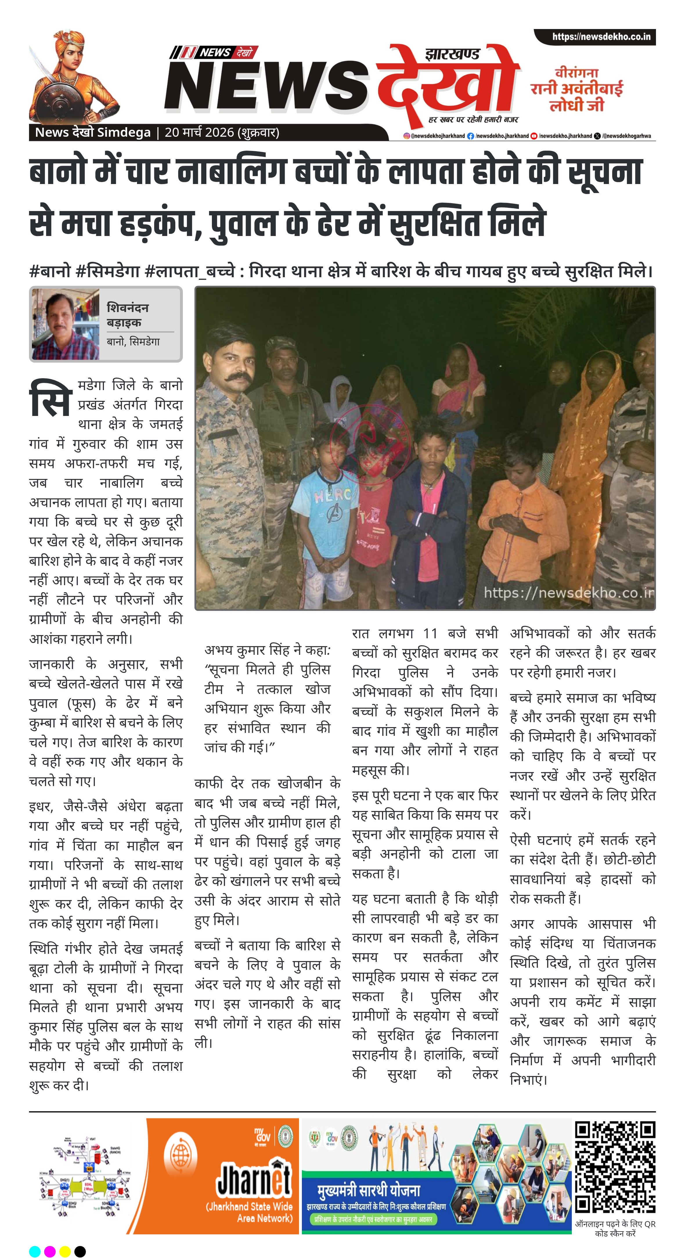 सिमडेगा जिले के बानो प्रखंड अंतर्गत गिरदा थाना क्षेत्र के जमतई गांव में गुरुवार की शाम उस समय अफरा-तफरी मच गई, जब चार नाबालिग बच्चे अचानक लापता हो गए। बताया गया कि बच्चे घर से कुछ दूरी पर खेल रहे थे, लेकिन अचानक बारिश होने के बाद वे कहीं नजर नहीं आए। बच्चों के देर तक घर नहीं लौटने पर परिजनों और ग्रामीणों के बीच अनहोनी की आशंका गहराने लगी।