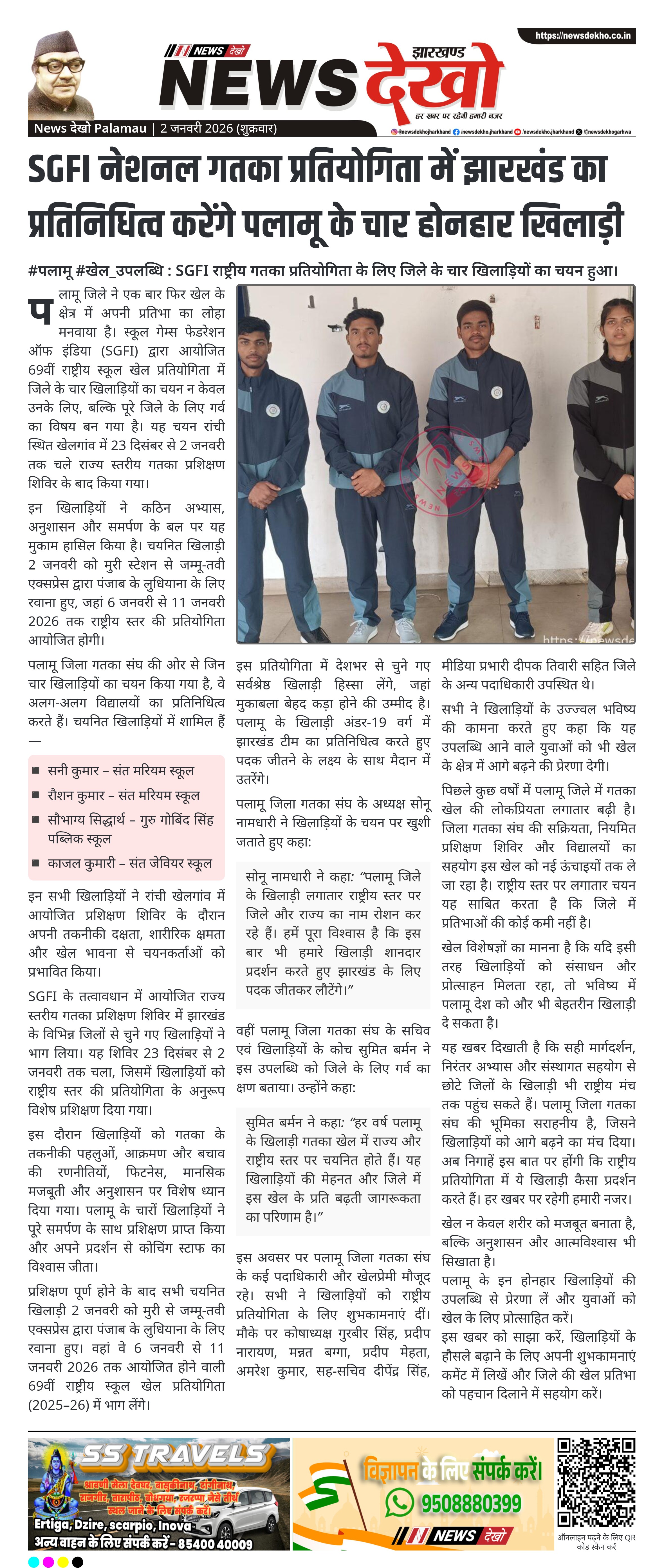 पलामू जिले ने एक बार फिर खेल के क्षेत्र में अपनी प्रतिभा का लोहा मनवाया है। स्कूल गेम्स फेडरेशन ऑफ इंडिया (SGFI) द्वारा आयोजित 69वीं राष्ट्रीय स्कूल खेल प्रतियोगिता में जिले के चार खिलाड़ियों का चयन न केवल उनके लिए, बल्कि पूरे जिले के लिए गर्व का विषय बन गया है। यह चयन रांची स्थित खेलगांव में 23 दिसंबर से 2 जनवरी तक चले राज्य स्तरीय गतका प्रशिक्षण शिविर के बाद किया गया।